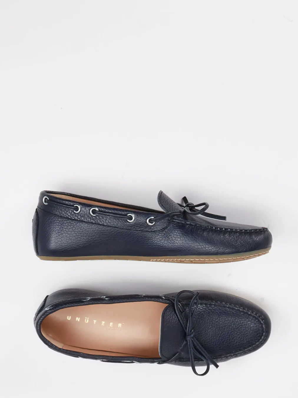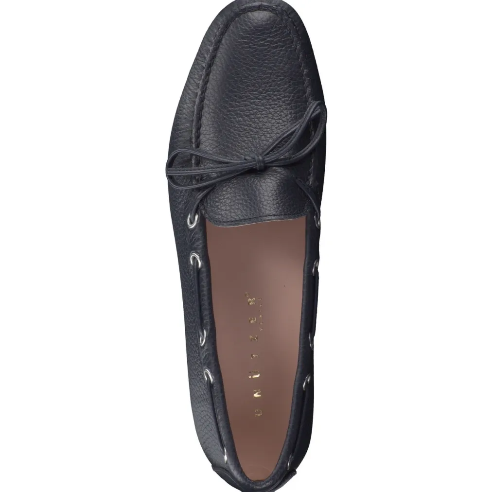 Dieser sommerliche Slipper der Marke Unützer zeigt sich hier in einer schlichten Interpretation auf einem ausgewogenen, moderaten Carréleisten. Das dunkelblaue Ziegenleder ist sportiv strukturiert. Die silberfarben glänzenden Ösen akzentuieren den schmalen, umlaufenden Senkel. Ein gummisohliger Slipper mit hervorragender Passform, unkompliziert und alltagstauglich zu tragen.