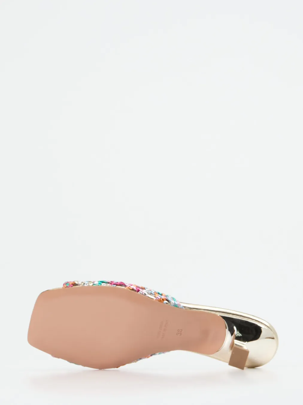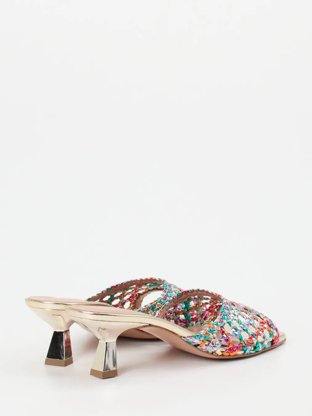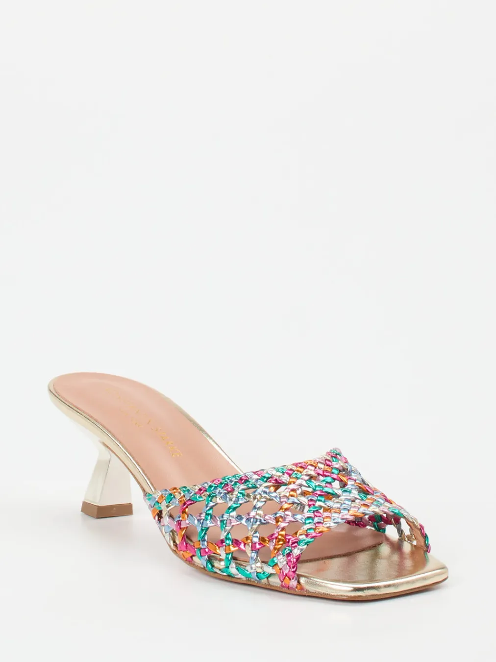 Blickfang für besondere Sommermomente.Konstantin Starke interpretiert klassische Damen-Mules in multicolor-optik neu. Ideal für festliche Anlässe wie Sommerpartys oder Events vereinen diese Mules aus metallisch glänzendem Flechtleder mediterrane Leichtigkeit mit Y2K-inspiriertem Design. Die spitz zulaufende, offene Silhouette wird durch eine eckige Zehenpartie und einen eleganten, goldfarbenen Kitten Heel betont. Das hochwertige Lederfußbett ist sanft gepolstert und sorgt für Komfort trotz Höhenwirkung. Die mehrfarbig geflochtene Struktur in Pink, Türkis und Orange wirkt verspielt und edel zugleich. Stylingtipp: harmonisch zu fließenden Maxikleidern oder Metallic-Accessoires kombinieren. Perfekt für trendorientierte Looks mit dem gewissen Etwas.