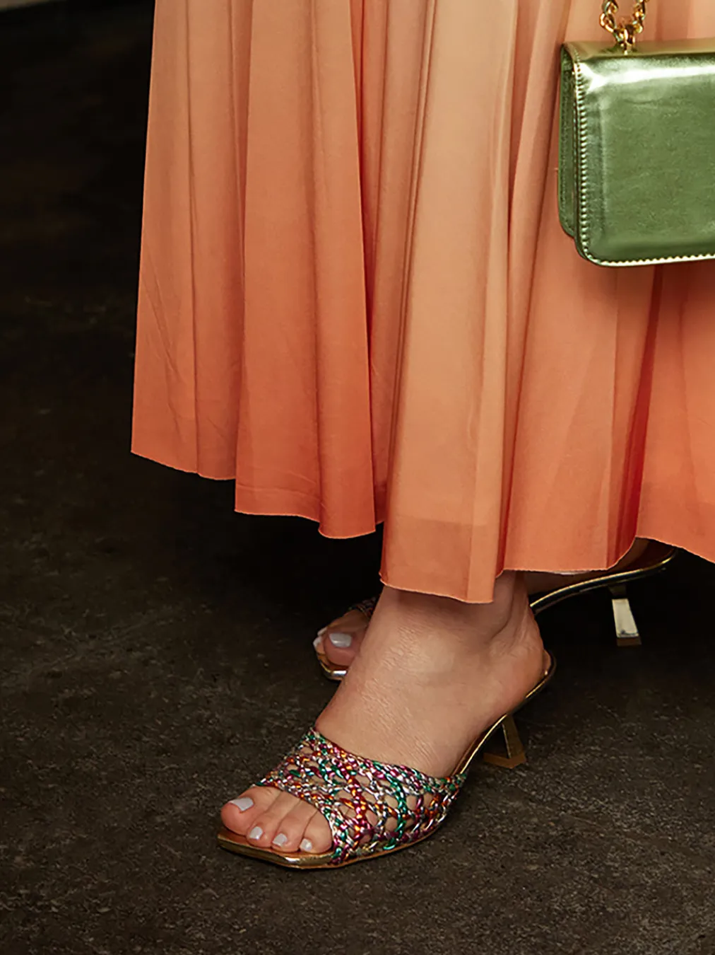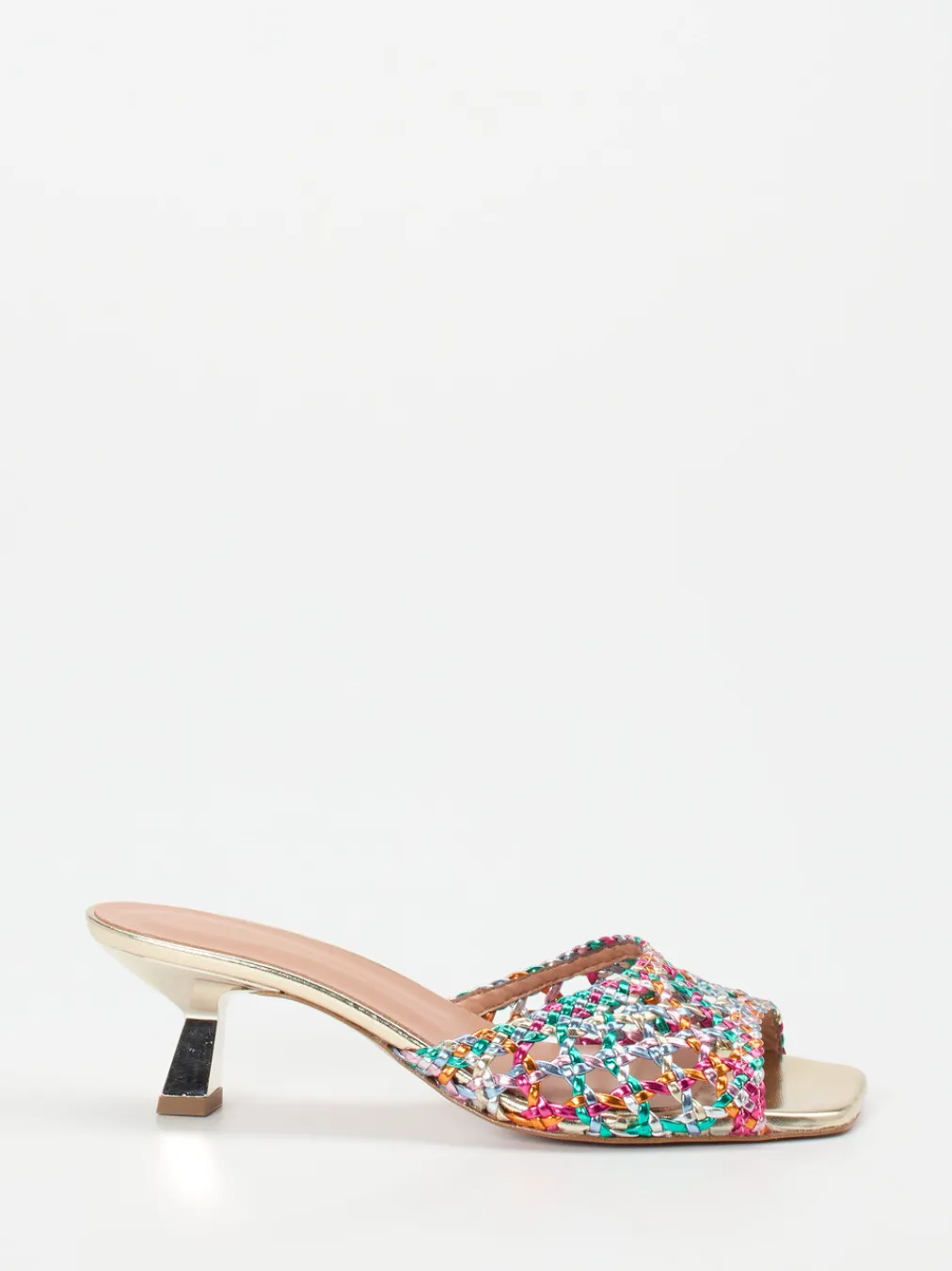 Glänzende Akzente und sommerliche Farbtöne treffen in dieser Pantolette auf feminine Eleganz. Das geflochtene Flechtleder kombiniert Y2K-Vibes mit einem modernen Silhouettenkonzept.
