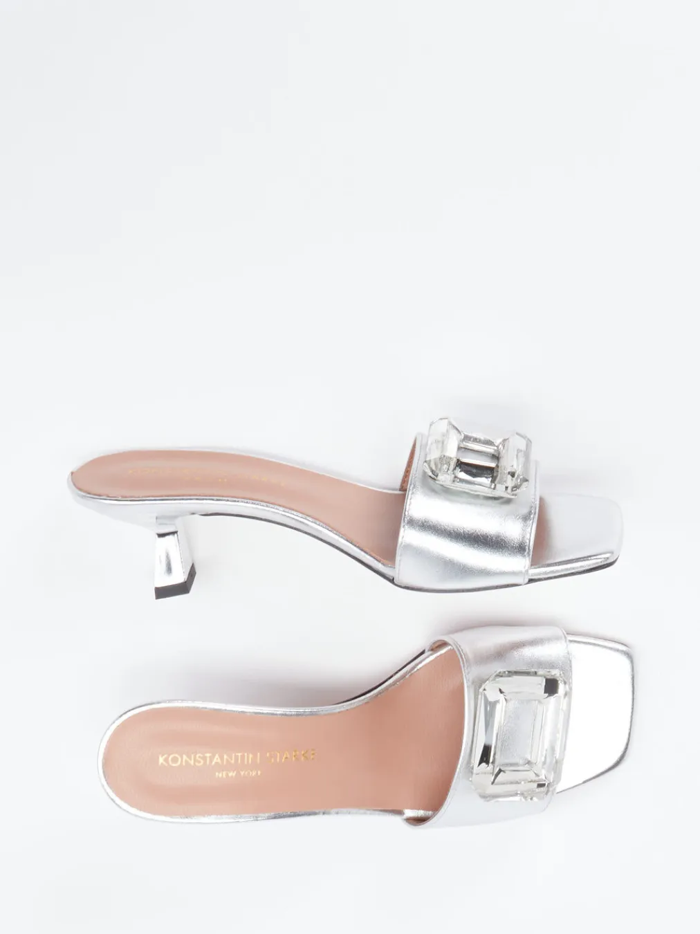 Glamour-Highlight für stilvolle Abende.Konstantin Starke präsentiert eine glänzende Damen-Mule mit modischem Statement. Ideal für den eleganten Auftritt bei abendlichen Events: Diese Pantolette aus silberfarbenem Lackleder überzeugt mit ihrer glänzenden Oberfläche und dem klaren, minimalistischen Design. Ein skulpturaler Kitten-Heel und eine große Acrylglasschnalle setzen auffällige Akzente. Die offene Silhouette in Schlupfform unterstreicht den modernen Y2K-Look, während die gepolsterte Innensohle ein angenehmes Tragegefühl schafft. Besonders gut kombinierbar zu Metallic-Accessoires oder Cocktailkleidern. Hochwertige Verarbeitung in ikonischer Trendoptik von Konstantin Starke.