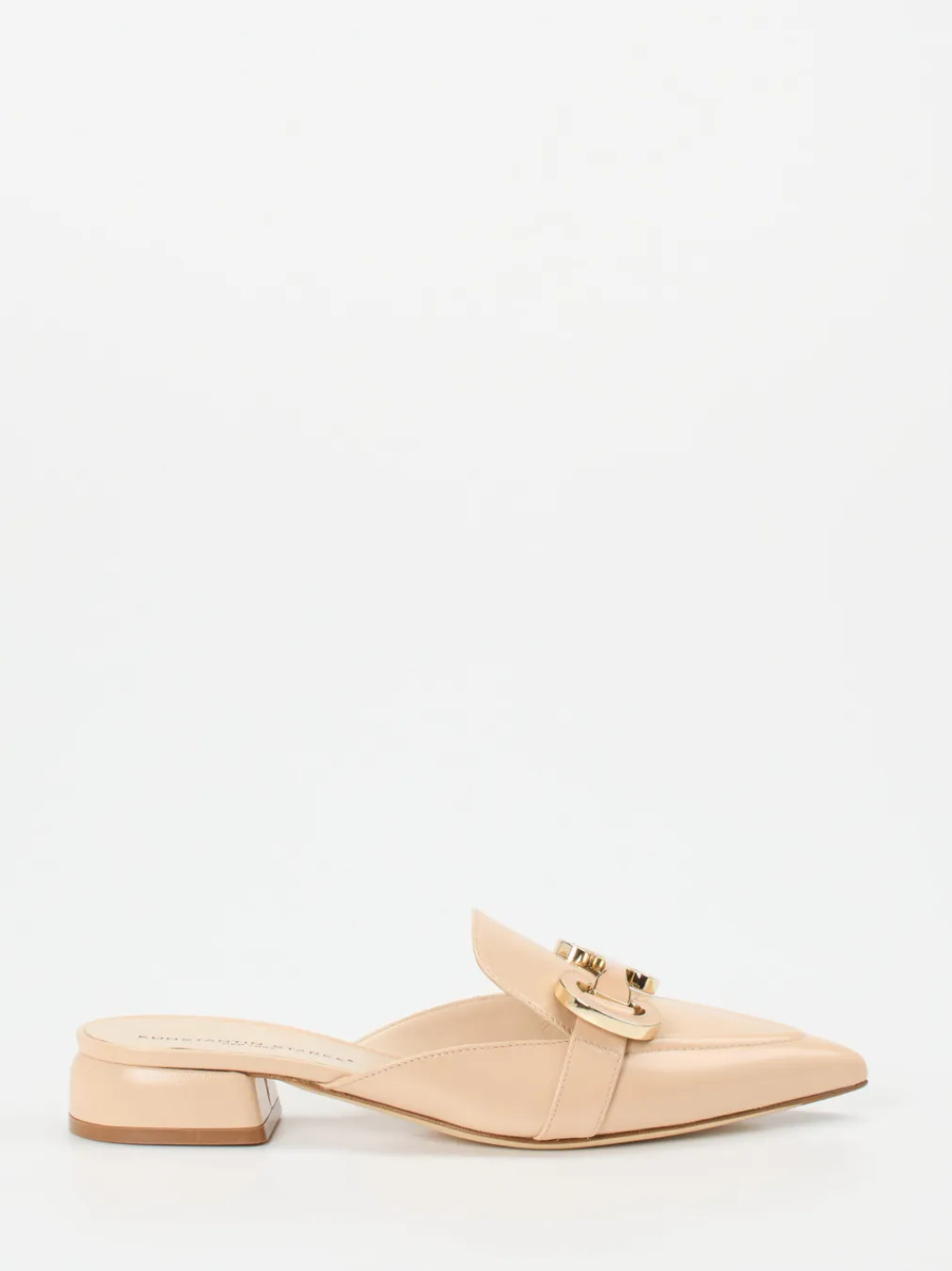 Diese Mules von Konstantin Starke verbinden glänzendes Lackleder mit einer goldfarbenen Statement-Spange – eine stilvolle Wahl für elegante Alltags- und Business-Looks.