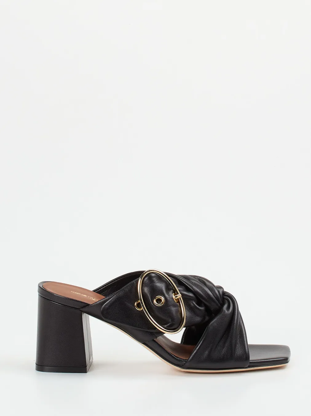 Ideal für laue Abendveranstaltungen oder City-Ausflüge bieten diese Mules Komfort und Stil zugleich. Das geschmeidige Lammleder mit leicht glänzender Oberfläche wirkt edel und modern. Die schwarze Farbgebung trifft auf eine gepolsterte Kreuzbandage und eine ovale, goldfarbene Schnalle, die als Design-Highlight fungiert. Der lederbezogene Blockabsatz in offener Silhouette ergänzt den zeitlos-minimalistischen Look und sorgt für ein sicheres Laufgefühl. Minimalistische Vintage-Elemente machen dieses Modell trendgerecht kombinierbar – etwa mit Culottes oder einem Midikleid.