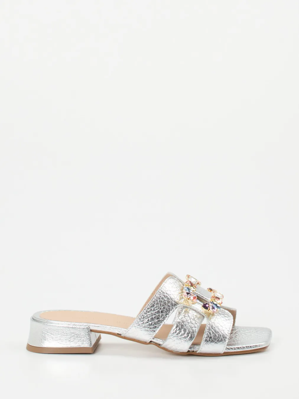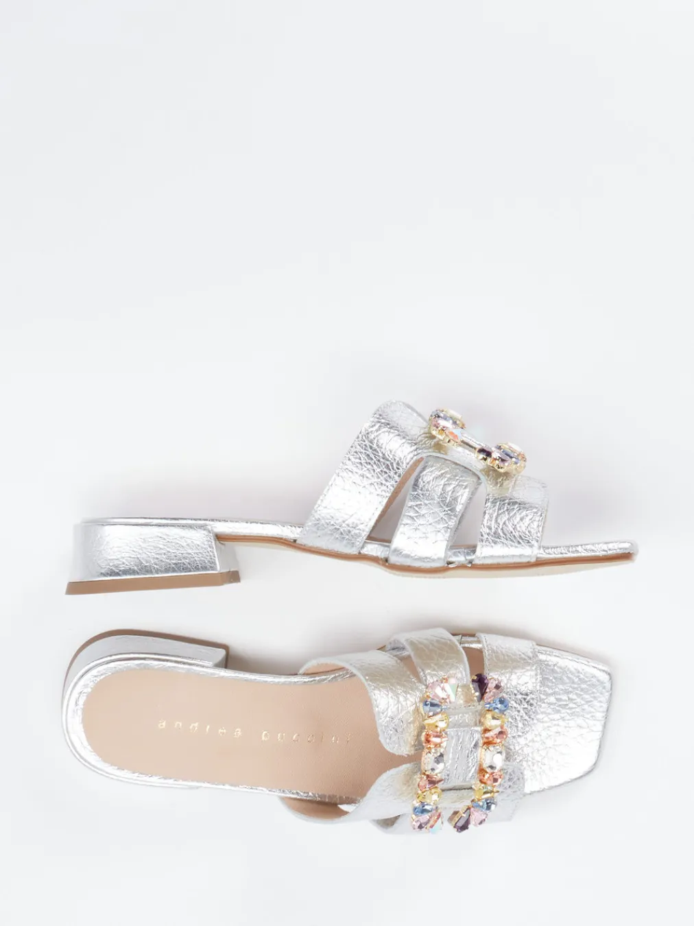 Glamour in seiner modernsten Form: Diese Mules verbinden Metallicleder mit farbiger Strassverzierung und bringen festliche Eleganz in modische Balance. Ideal für stilvolle Auftritte am Abend.