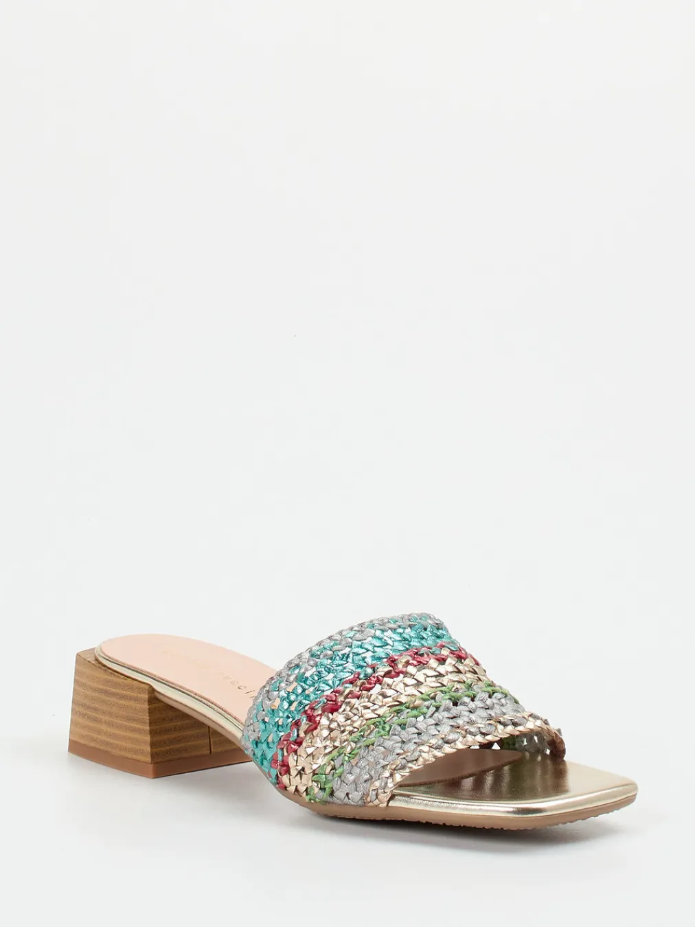 Diese Mules vereinen sommerliche Multicolor-Flechtstruktur mit einem eleganten Metallic-Finish und komfortablem Blockabsatz – inspiriert vom Boho- und Retro-Glam-Trend.