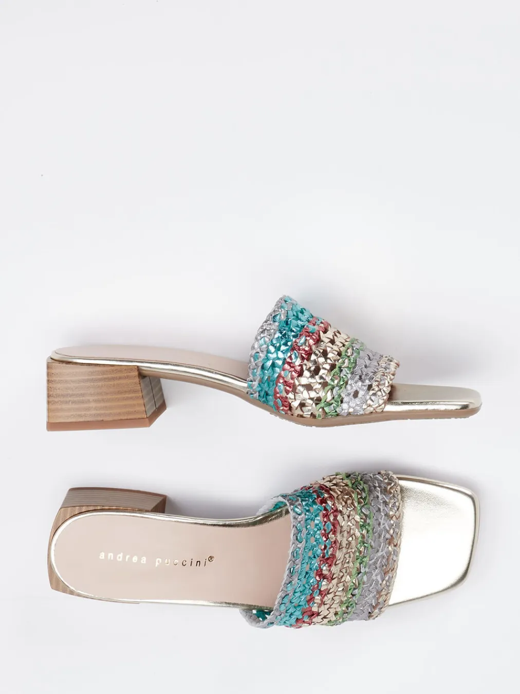 Multicolor-Flechtung trifft Metallic-Look.Andrea Puccini interpretiert Mules für Damen mit glänzendem Metallicleder neu. Ideal für Urlaubstage oder entspannte Partys: Das offen gearbeitete Modell in Schlupfform bietet mit seiner eckigen Front, dem Multicolor-Flechtmuster und dem mittelhohen Blockabsatz in Holzoptik ein stilvolles Tragegefühl. Die Oberfläche glänzt in sommerlichen Nuancen von Gold bis Hellblau und verleiht dem Flecht-Look eine trendige Metallic-Anmutung. Eine honigfarbene Gummisohle ergänzt die leichte Bauweise. Das Design trifft den aktuellen „Craftcore“-Trend und lässt sich hervorragend zu fließenden Sommerkleidern oder Boho-Accessoires kombinieren. Stilvoller Komfort für warme Tage mit charakteristischer Signatur.