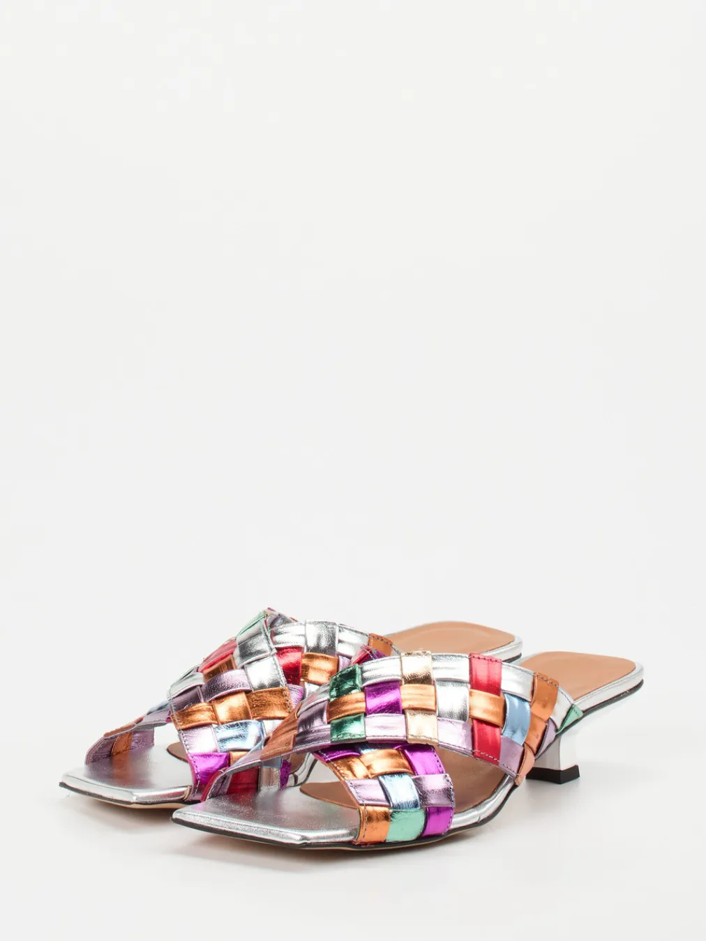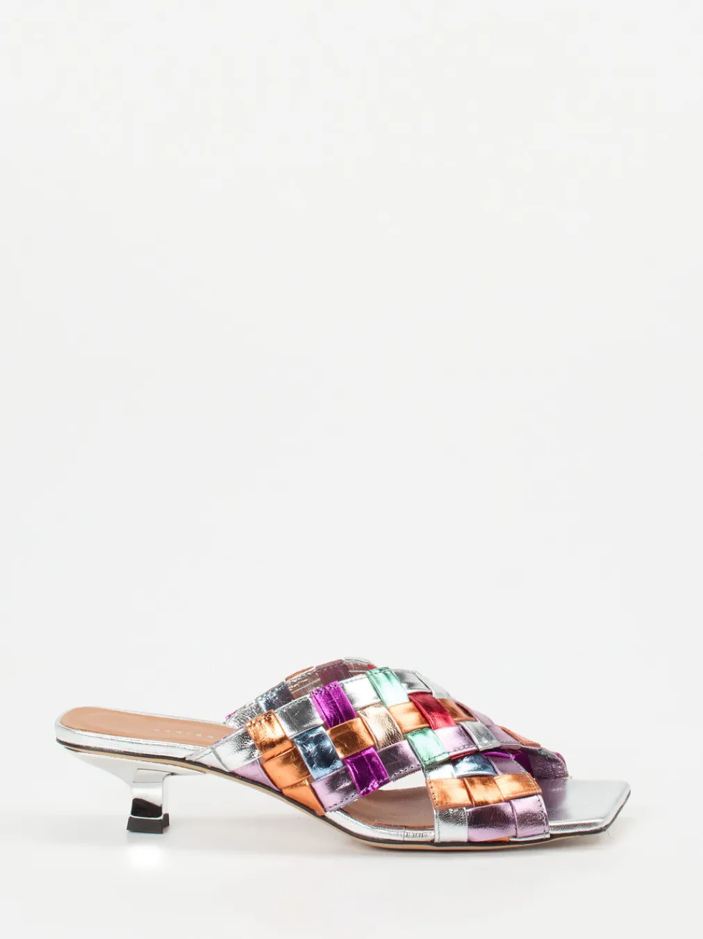 Diese multicolorfarbenen Mules spielen gekonnt mit Y2K-Ästhetik und luxuriöser Handwerkskunst. Metallic-Flechtwerk und silberner Kitten Heel setzen ein starkes Fashion-Statement.