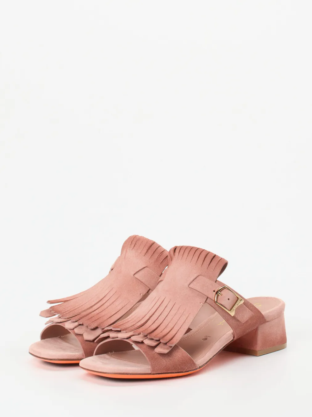 Sommer mit Stil und Struktur.Die Damen-Mules von Santoni bringen modernen Retro-Charme in die warme Jahreszeit. Für stilbewusste Momente zwischen Citybummel und Sommerabend bietet das Modell hochwertigen Tragekomfort auf samtigem Veloursleder mit mattierter Oberfläche. Die dominierende Altrosa-Farbe wird durch eine goldfarbene Schnalle sowie Fransenakzente auf den Querriemen elegant kontrastiert. Der offene Schnitt mit komfortablem Blockabsatz trifft auf eine neonorange Laufsohle, die als visuelles Highlight und rutschhemmendes Funktionselement überzeugt. Ein Design, das die aktuellen Quiet-Luxury- und Statement-Trends aufgreift. Kombiniert mit fließender Tunika oder minimalistischen Outfits entfalten die Pantoletten ihr volles Stilpotenzial. Italienisches Handwerk für souveräne Looks mit Leichtigkeit.