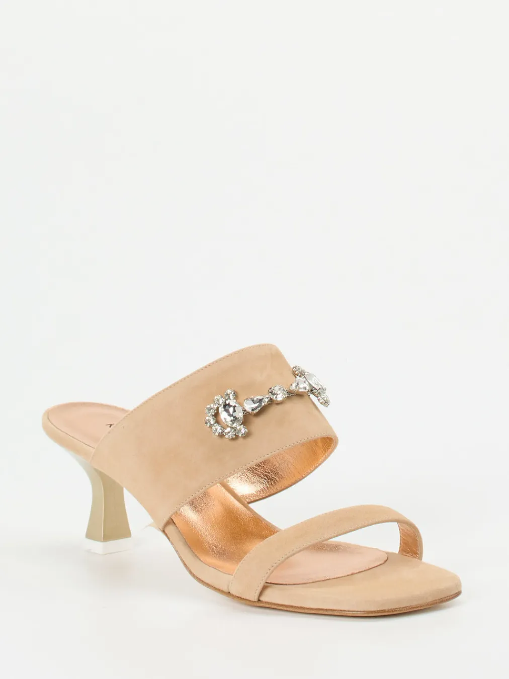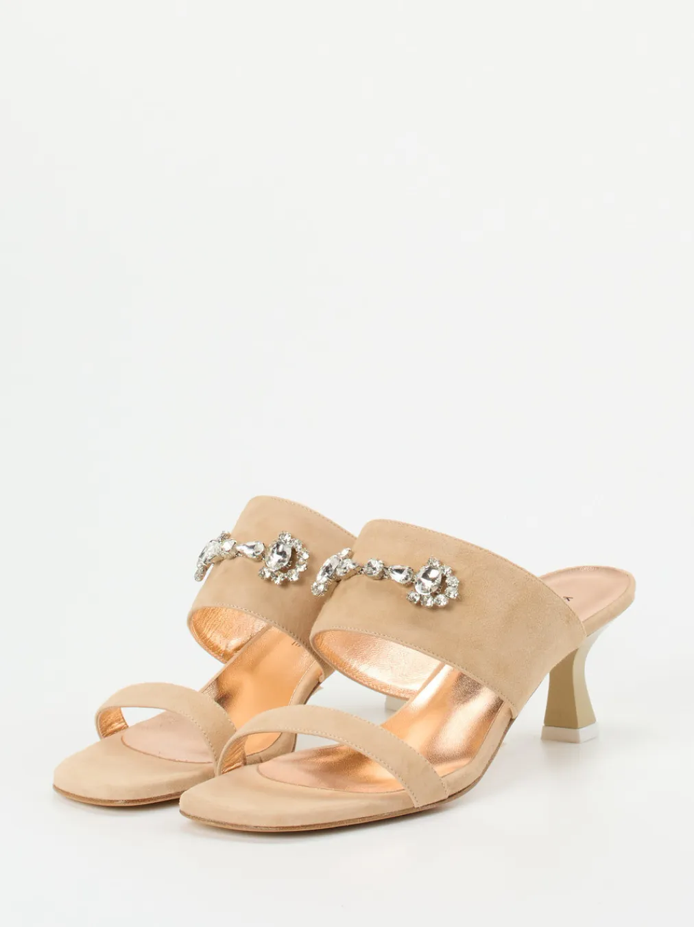 Ob stilvoller Empfang oder eleganter Stadtbummel – das beigefarbene Veloursleder mit samtiger Oberfläche wird durch breite Riemen und funkelnde Strassdetails akzentuiert. Innen überzeugt weiches Kalbleder mit leichtem Metallic-Schimmer und Polsterung. Die offene Silhouette, kombiniert mit dem skulptural geformten Kitten Heel in Goldoptik, folgt aktuellen Ornamentik- und Vintage-Trends. Die feine Ledersohle unterstreicht den anspruchsvollen Charakter. Ideal zu Seidenkleidern oder cremetonigen Tailor-Looks.