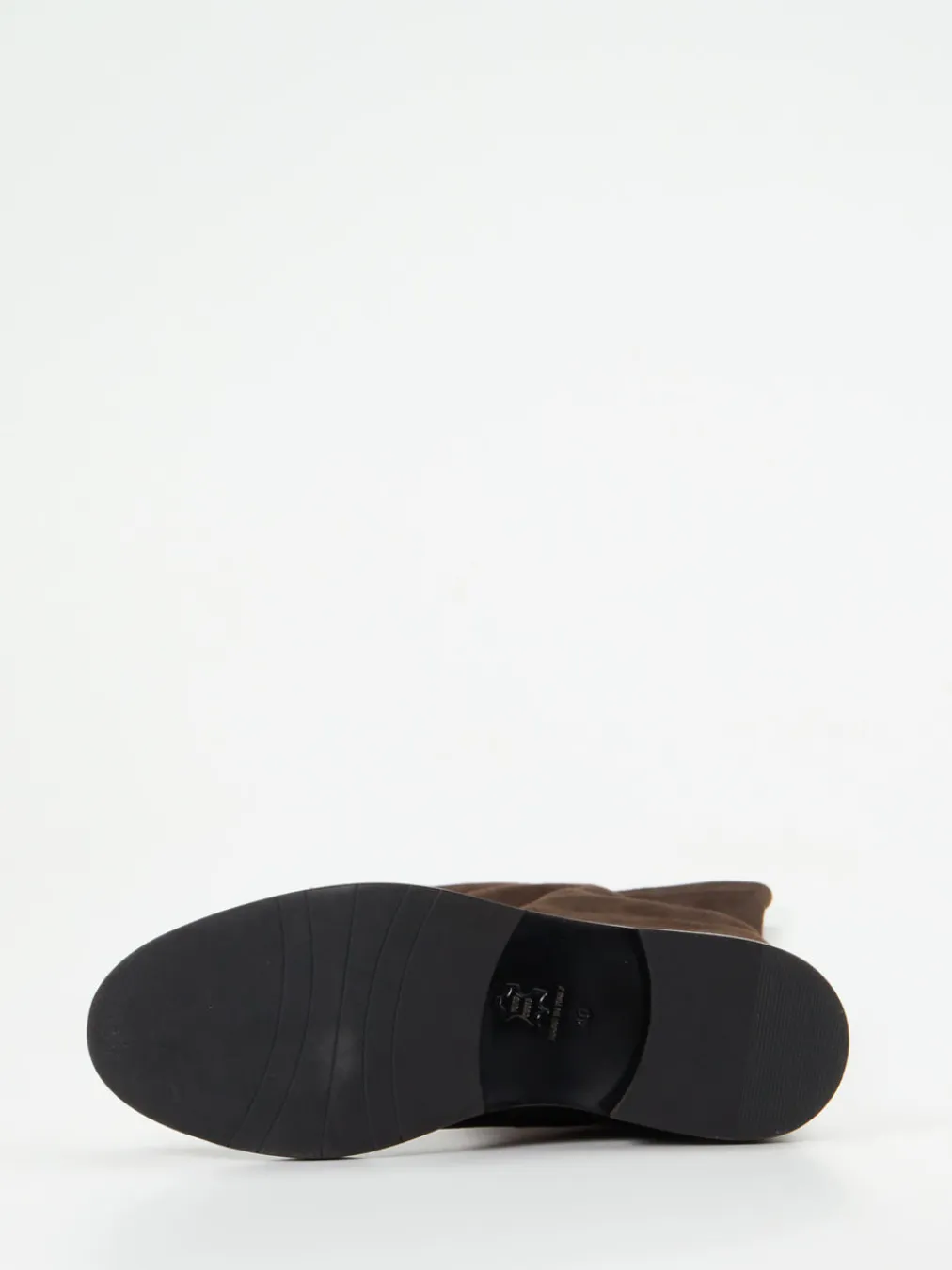 Dieser Overknee-Stiefel vereint edles Veloursleder mit minimalistischer Silhouette und subtilen Designakzenten – ein stilvoller Begleiter für urbane Looks im Herbst und Winter.