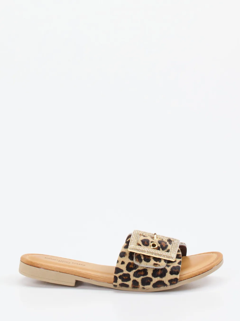 Leopard trifft Luxusdetails.Die Marke Konstantin Starke zeigt mit dieser Damen-Pantolette eine extravagante Slide-Sandale im Y2K-Stil. Für entspannte Stunden im Café oder ein sommerliches Garden-Event verbindet diese offene Sandale flache Form mit hoher Stilwirkung. Obermaterial aus Fell unterstreicht die strukturierte Leopardenoptik, ergänzt durch eine breite Schnalle in Goldoptik mit silberfarbenem Strassbesatz. Das lederbezogene Fußbett ist weich gepolstert und sorgt für Tragekomfort den ganzen Tag. Goldene Details und Animal Print vereinen Glamour mit Trendgespür. Ideal zu schlichten Outfits oder mutigen Prints. Ein modischer Sommerfavorit mit Statement-Charakter von Konstantin Starke.