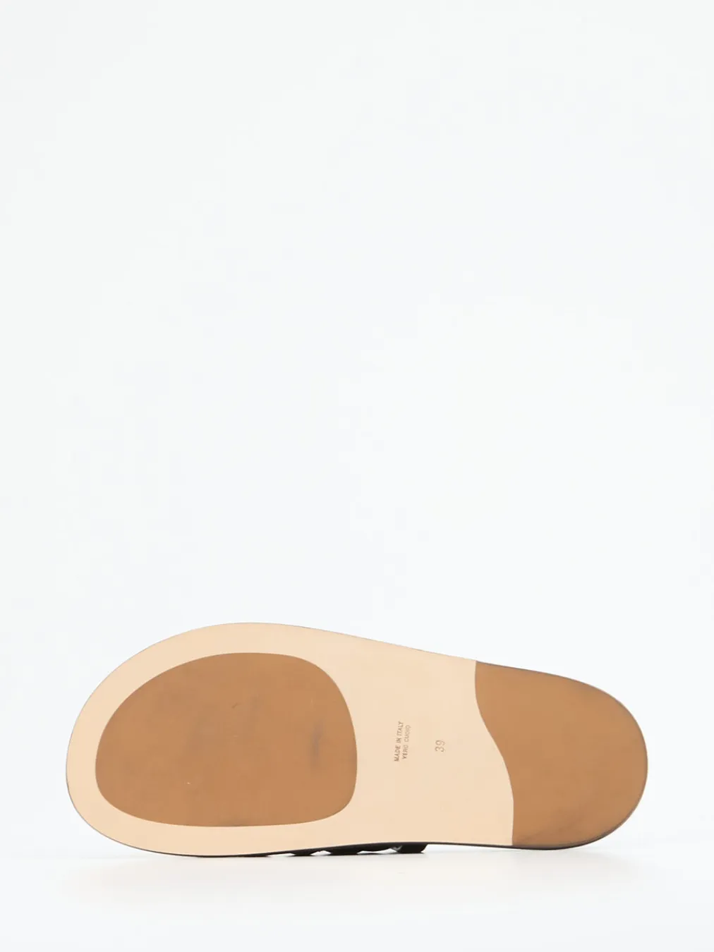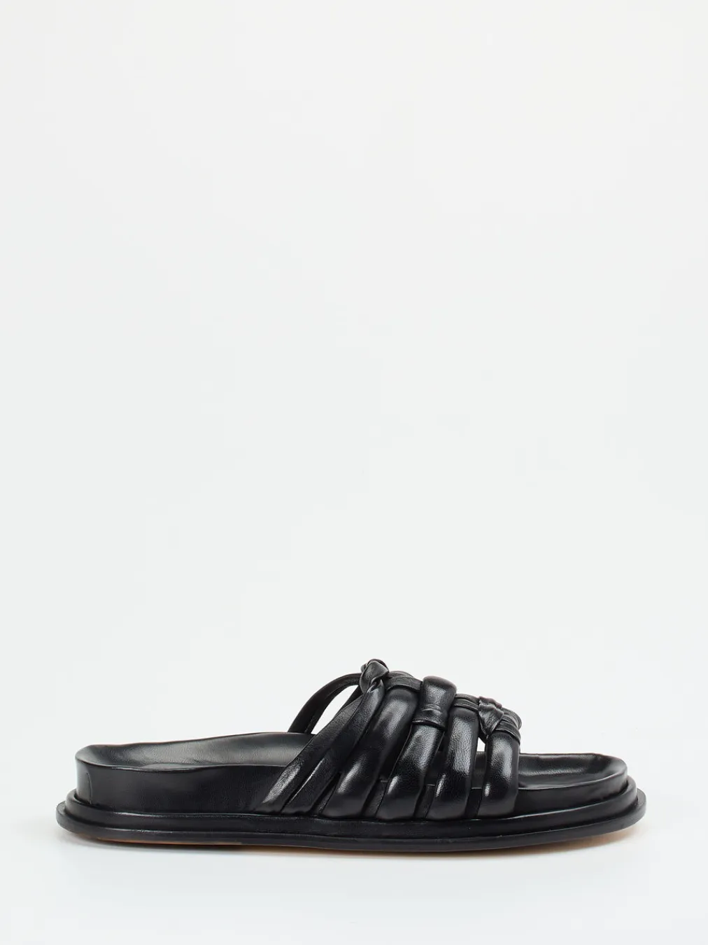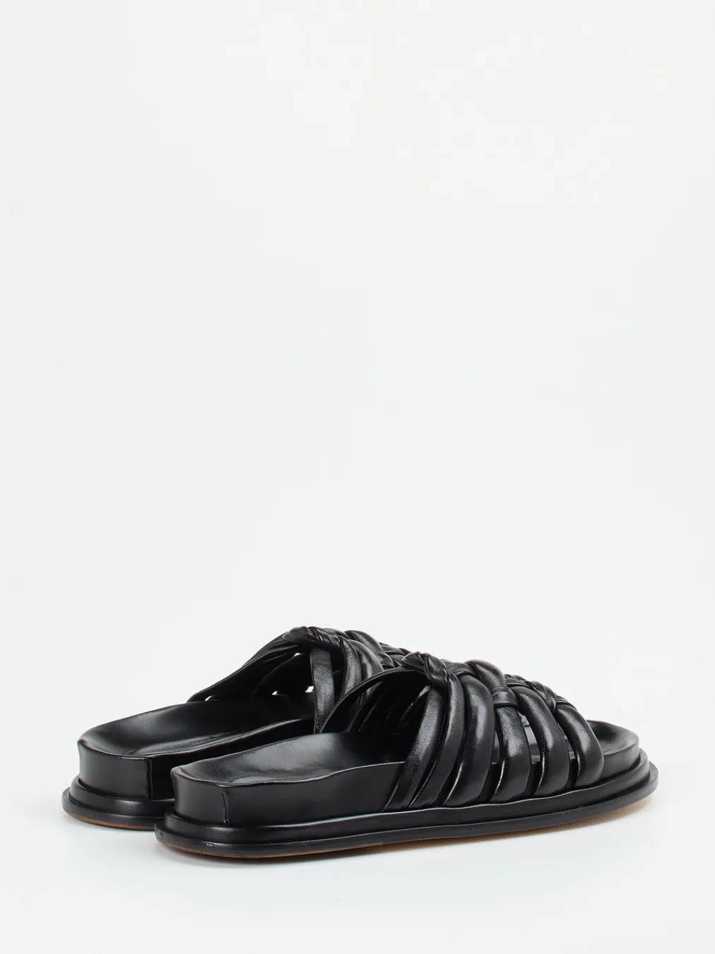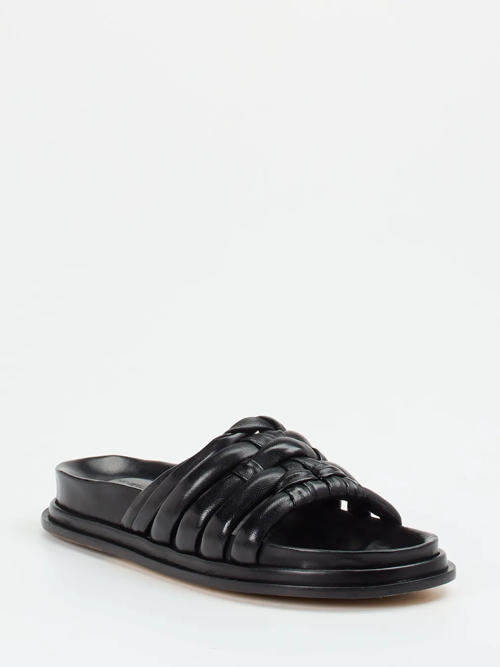 Gepolstertes Lammnappaleder und eine geflochtene Struktur verbinden sich hier zu einem modernen Slide mit dezentem Luxusgefühl – unkompliziert und stilbewusst.