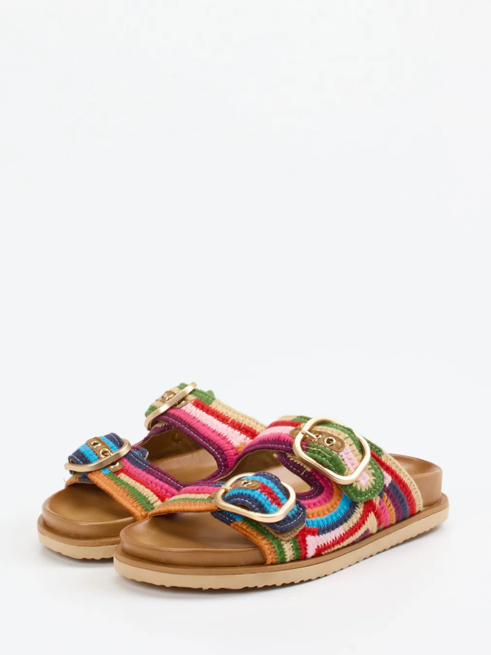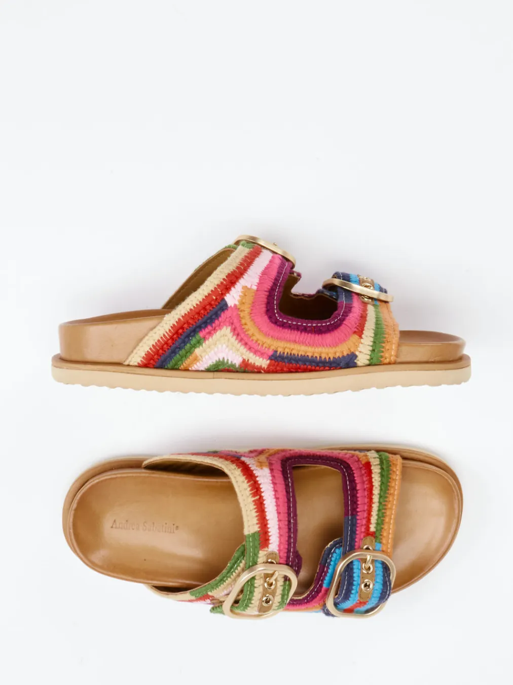 Sommerlicher Eyecatcher für urbane Auszeiten.Die Damen-Pantolette von Andrea Sabatini begeistert mit farbenfrohem Boho-Charme. Ideal für spontane Stadtbummel oder entspannte Strandtage überzeugt das Modell durch ein gehäkeltes Textil-Obermaterial im intensiven Multicolor-Streifenmix. Goldfarbene Doppel-Schnallen setzen edle Akzente und lassen sich individuell anpassen. Das anatomisch geformte Fußbett ist lederbezogen und sorgt für hohen Komfort, während eine flache Gummisohle mit feinem Profil sicheren Halt gibt. Das offene Design und die markentypische Farbfreude machen diese Slides zu einem Trendstück im Craftcore-Stil der Saison. Charakterstarkes Modell mit italienischem Flair und spürbarem Komfort.