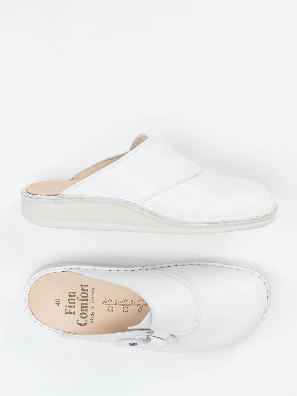 Diese Komfort-Pantolette von Finn Comfort kombiniert langlebiges Kalbleder mit durchdachtem Fußbett und klarer Formensprache – ideal für entspannte Alltagsmomente.