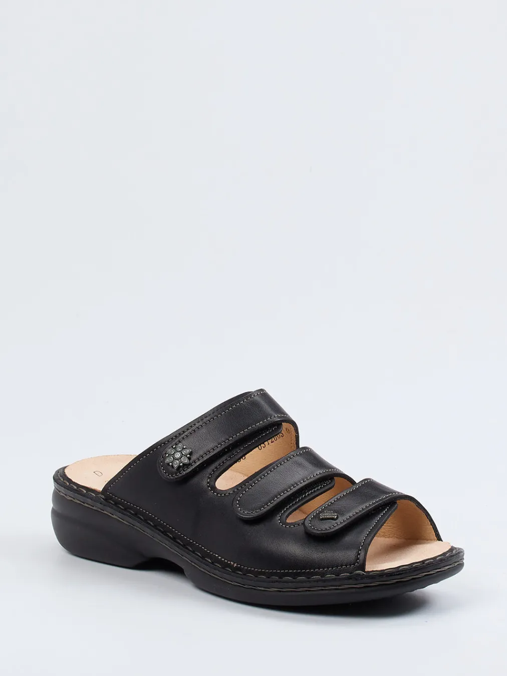 Bequem durch Alltag und Freizeit.Finn Comfort präsentiert mit dieser Damen-Kategorie eine ergonomisch geformte Pantolette aus schwarzem Kalbleder. Für den entspannten Einsatz zu Hause oder in der Freizeit bietet das Modell mit drei verstellbaren Klettverschlüssen flexible Anpassung und perfekten Halt. Das hochwertige, matt strukturierte Glattleder ist mit Kontrastnähten akzentuiert und wird durch einen silberfarbenen Zierknopf mit Blumenprägung ergänzt. Die gepolsterte, lederbezogene Innensohle mit Korkkern bietet angenehme Dämpfung; das orthopädisch inspirierte Design spiegelt sich in der leicht erhöhten, rutschhemmenden Gummisohle wider. Ideal für komfortaffine Stylingkombinationen mit legerem Charakter. Handwerkskunst für anspruchsvolle Füße mit spürbarem Finn Comfort Mehrwert.