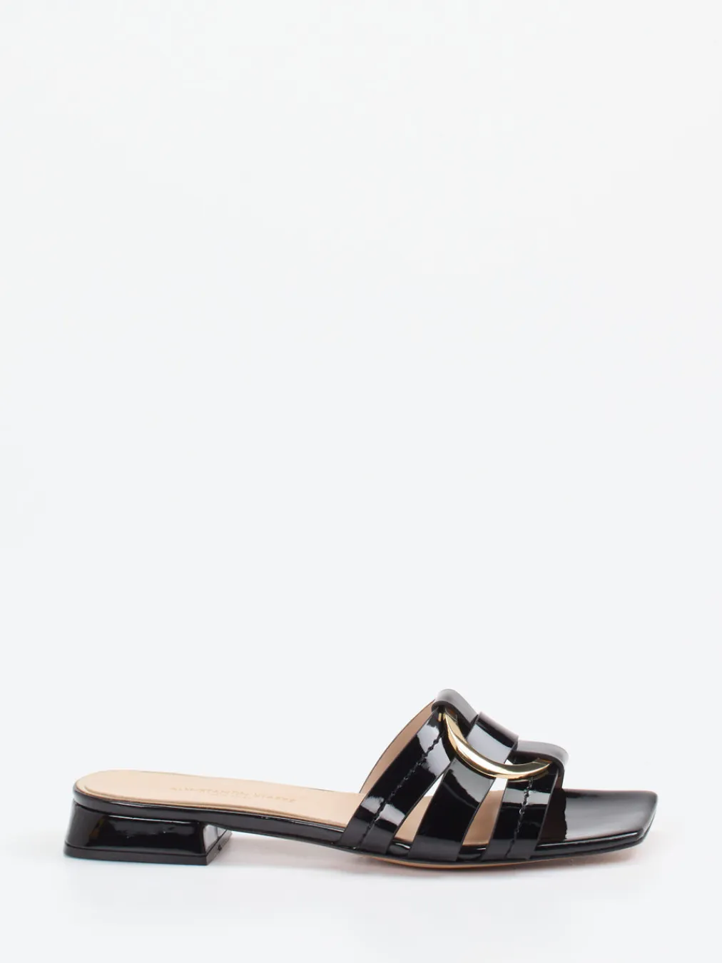 Diese edlen Mules vereinen hochglänzendes Lackleder mit einem stilprägenden Goldakzent – ein minimalistisches Design, das unaufdringliche Eleganz und modisches Feingefühl ausdrückt.