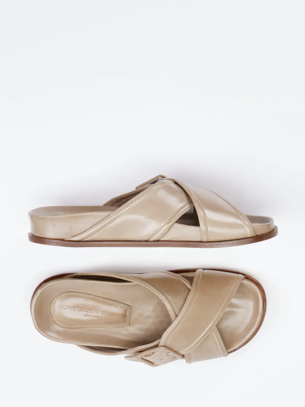 Eleganter Auftritt für warme Tage.Die Damen-Pantolette von Konstantin Starke verbindet dezente Raffinesse mit sommerlicher Leichtigkeit. Ideal für entspannte Stadtbummel oder Urlaubsmomente: Gefertigt aus hochwertigem Lammleder mit glänzender Oberfläche, zeigt sich das Modell in einem edlen Champagnerton. Gekreuzte Riemen, eine farblich abgestimmte, lederbezogene Metallschnalle und Ton-in-Ton-Nähte unterstreichen das minimalistische Design. Die offene, flache Silhouette mit gepolstertem Fußbett und Ledersohle sorgt für Komfort und Eleganz zugleich. Stilistisch orientiert sich die Pantolette am aktuellen Trend „Quiet Luxury“. Ein hochwertiger Begleiter für bewussten Stil mit Zurückhaltung.