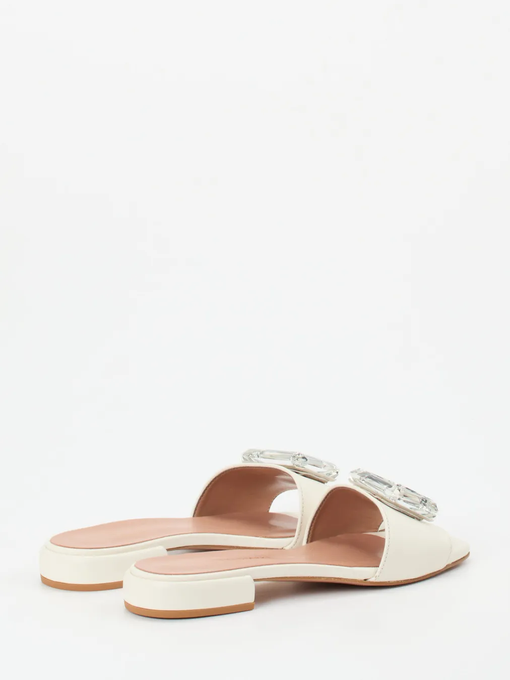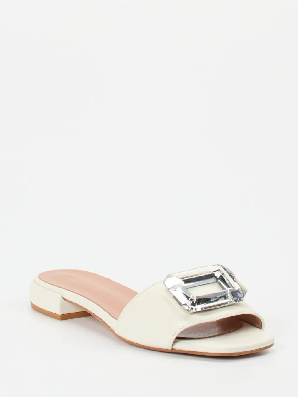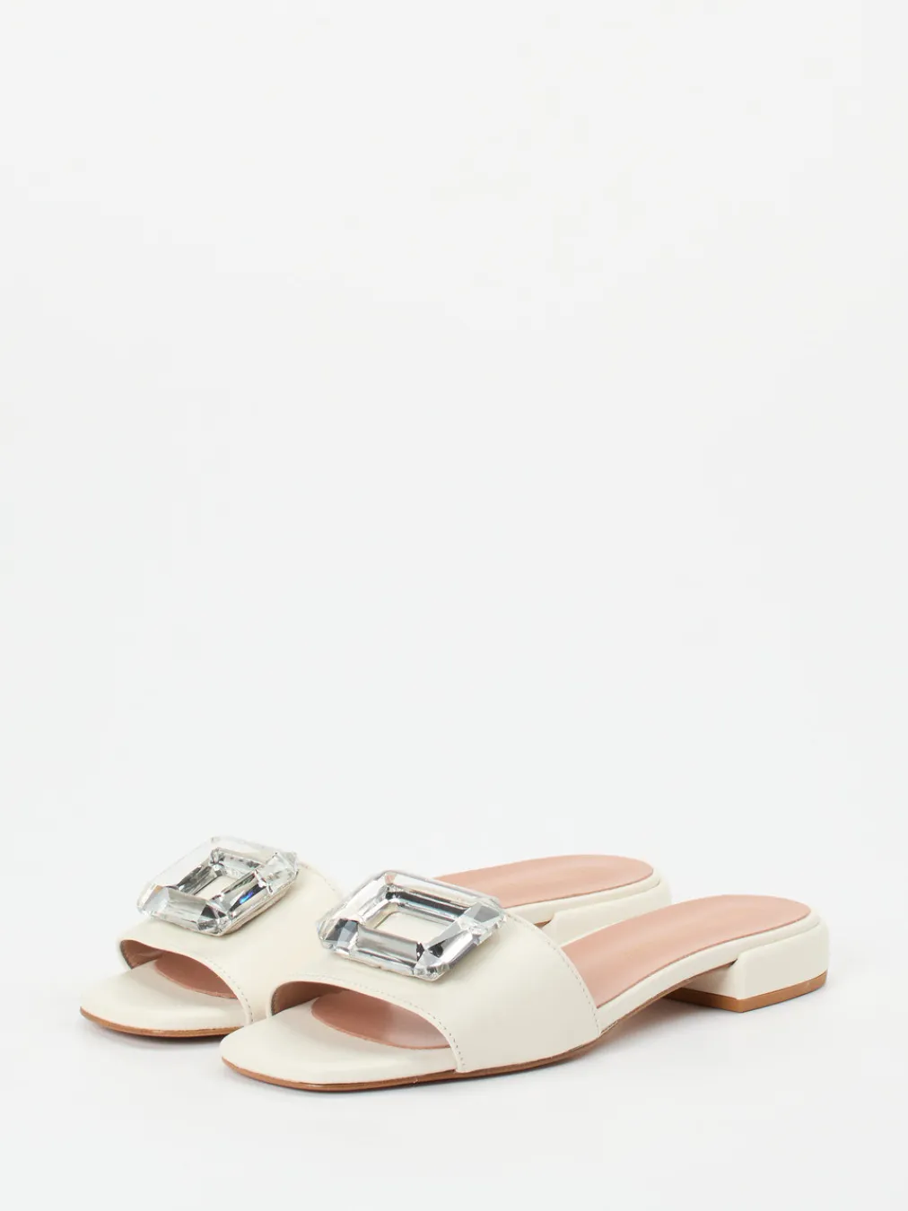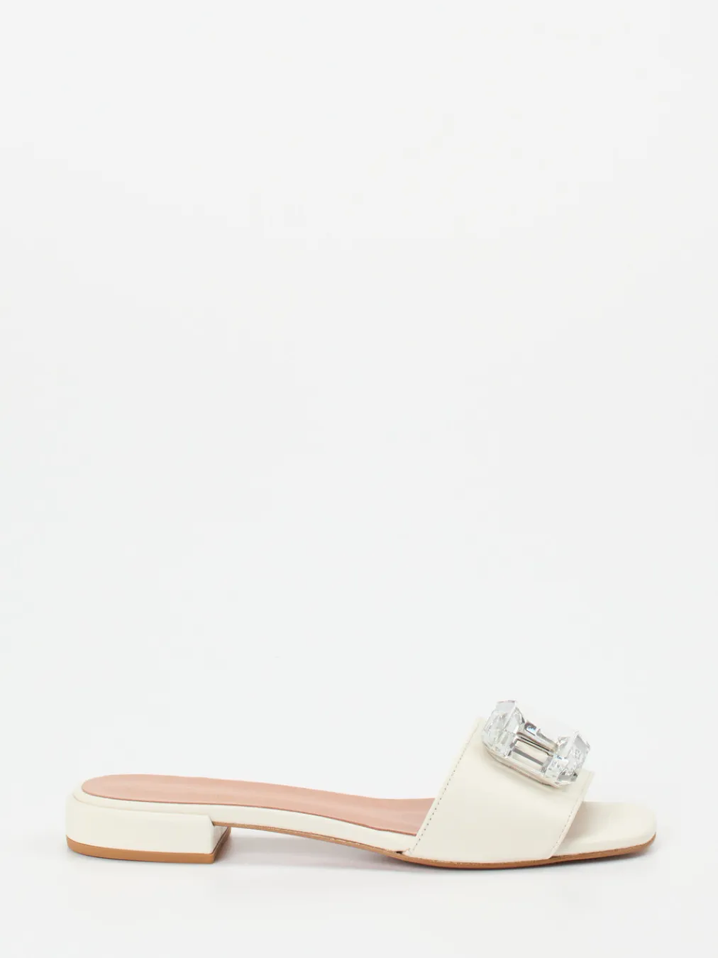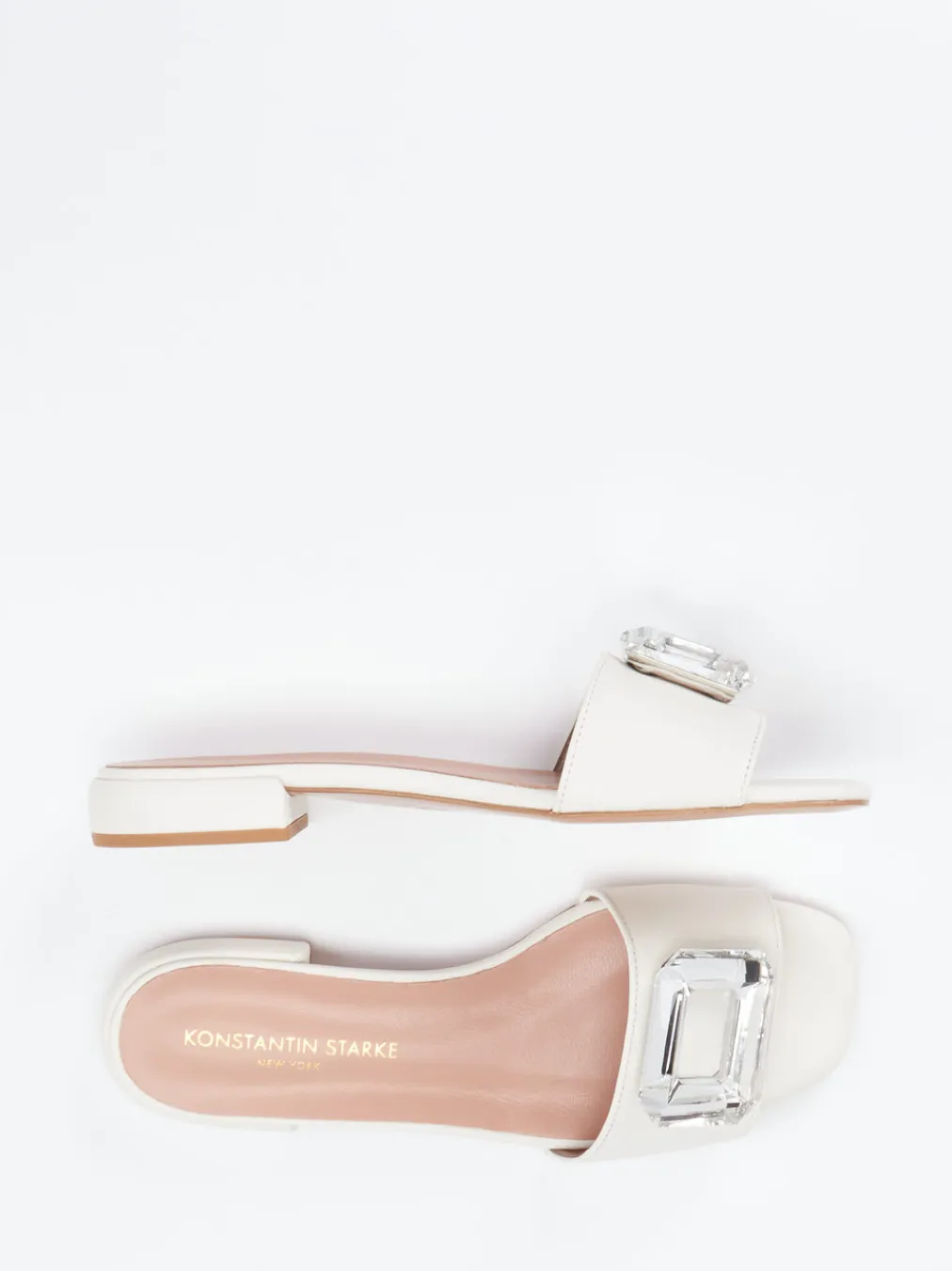 Minimalistisches Design trifft auf luxuriöse Feinheit. Die cremefarbene Pantolette punktet mit Glattleder und markantem Kristall-Dekor.