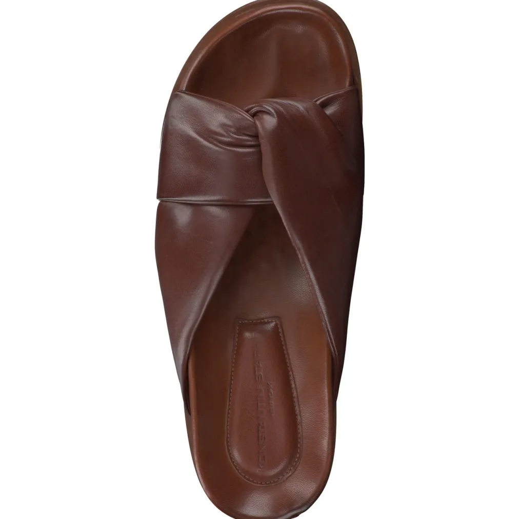 Modisch anspruchsvoll präsentiert die Marke Konstantin Starke diese Pantolette aus wunderbar weichem, cognacfarbenem Lammnappaleder. Die breiten, lässig überkreuzten Riemchen sind markant gepolstert. Einen besonders angenehmen Tragekomfort verspricht das anatomisch geformte Leder-Fußbett. Durch die Gummiintarsie wird die betonte, wertige Ledersohle flexibel.