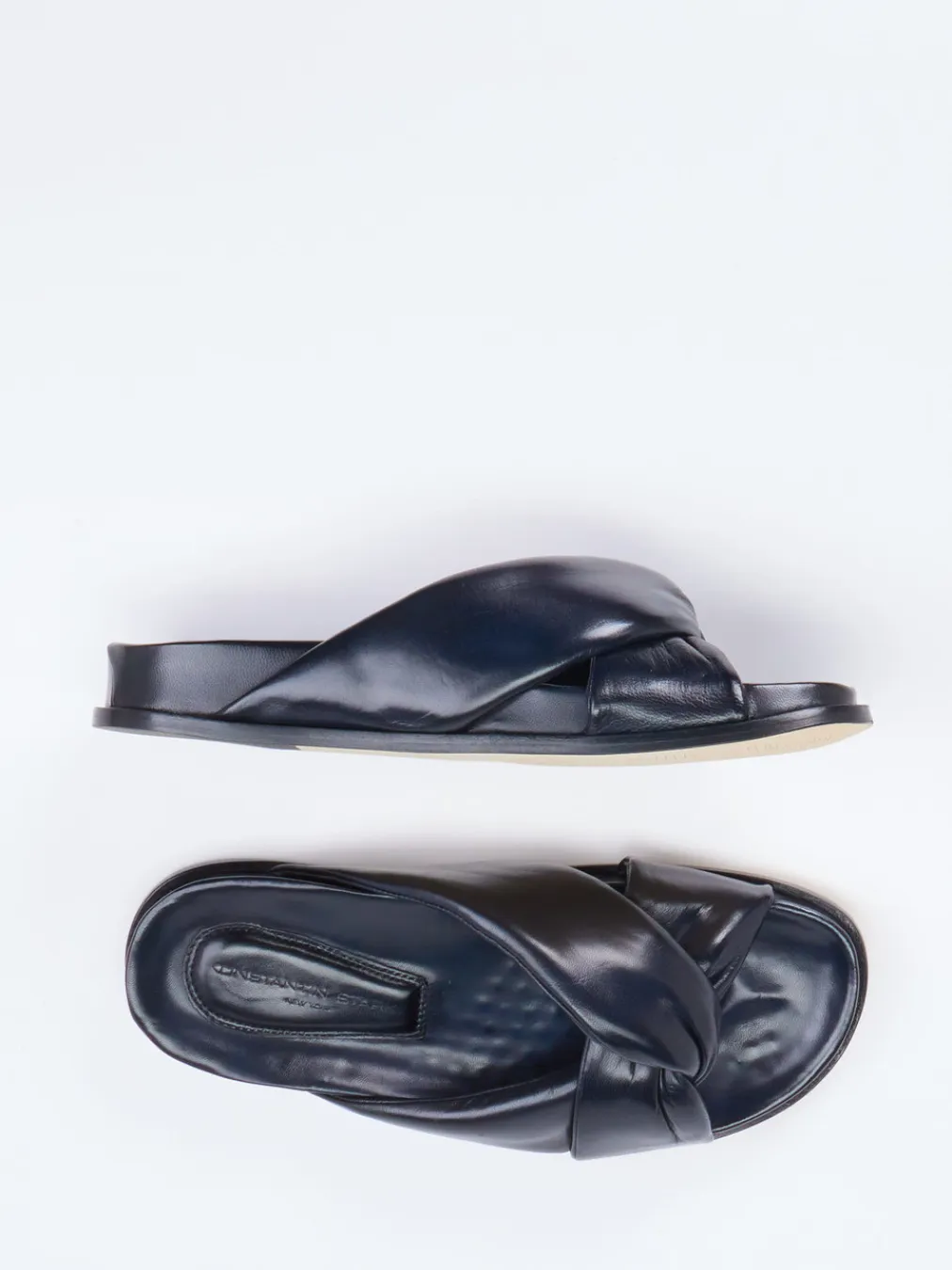 Attraktiv und modisch präsentiert die Marke Konstantin Starke diese Pantolette auf einem modernen Tieffußbett. Bestechend weich zeigt sich das dunkelblaue Lammnappaleder aufgrund der gepolsterten Riemchen, die auf dem Blatt gekreuzt miteider verbunden sind. Der Leisten ist besonders bequem. Die Ledersohle mit der Gummiintarsie unterstreicht die anspruchsvoll sommerliche Aussage.