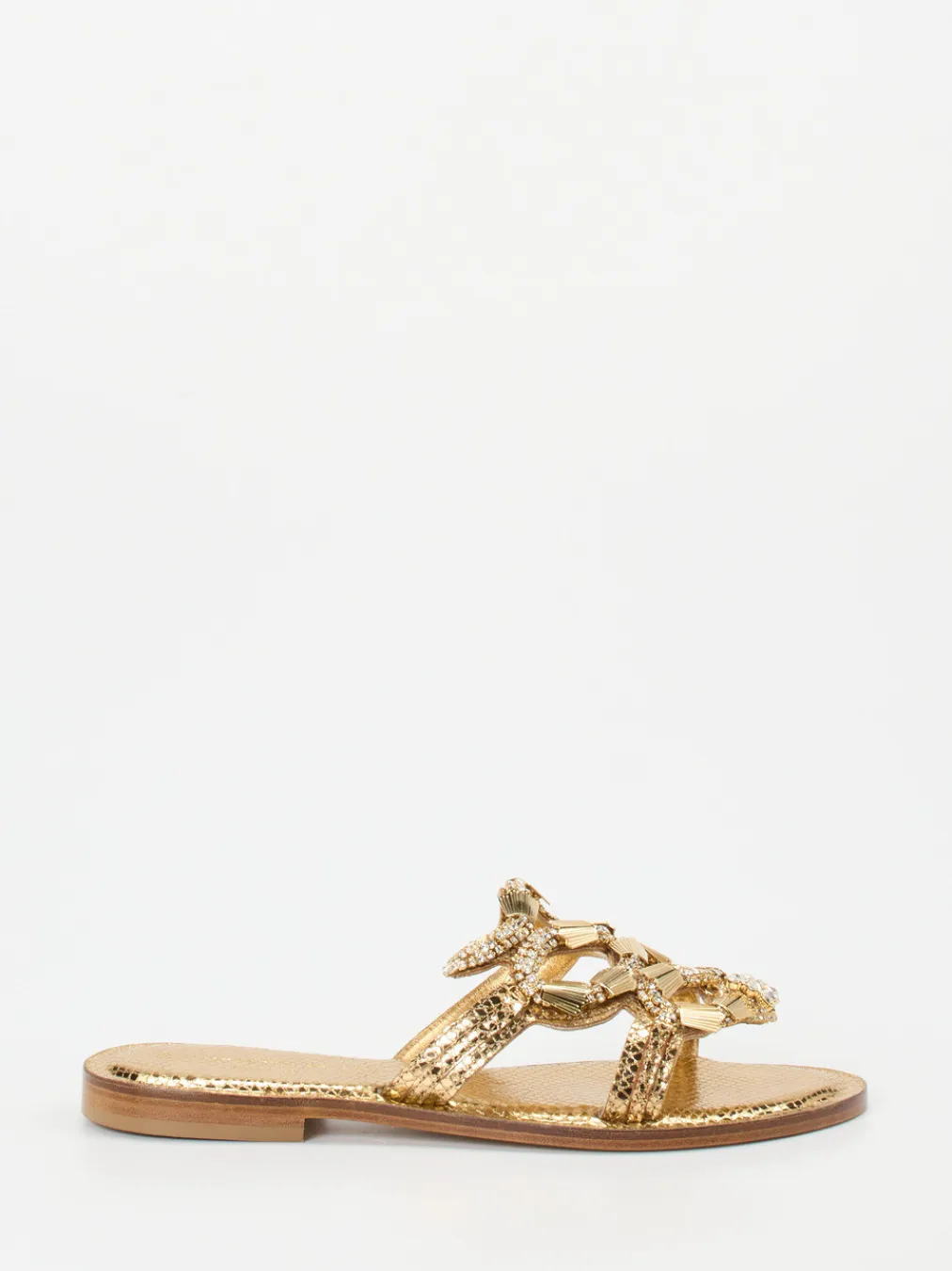 Goldglänzende Eleganz trifft feinste Handwerkskunst: Diese Slip-On-Sandalen verleihen jedem Look ein exquisites Finish mit luxuriösen Details.