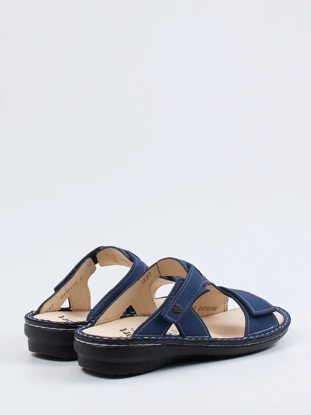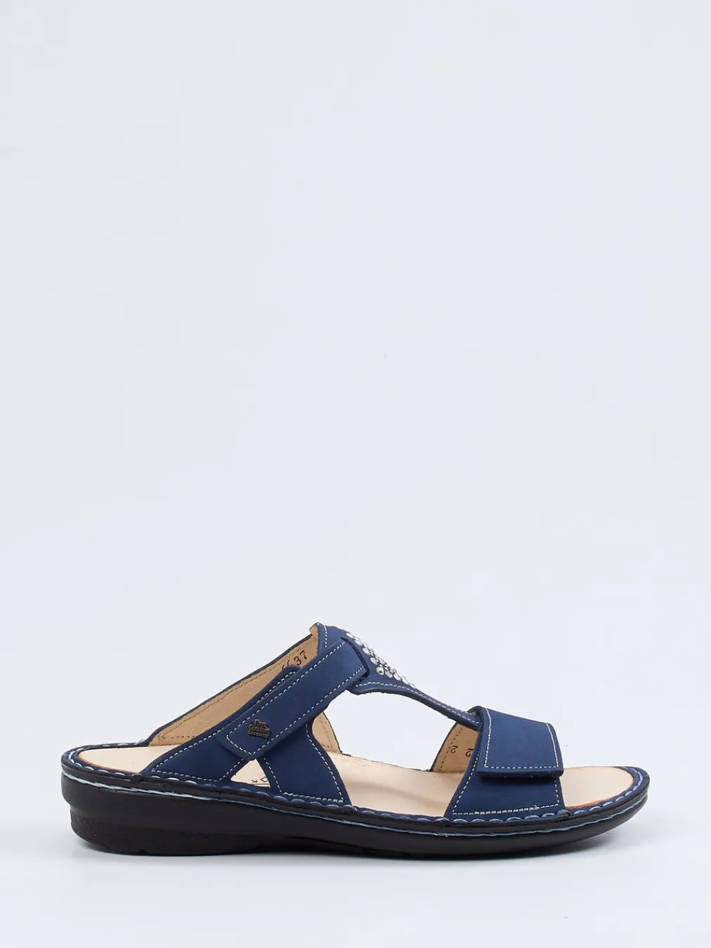 Funktion trifft feine Details.Die Marke Finn Comfort präsentiert eine Damen-Pantolette für höchste Ansprüche an Tragekomfort und Optik. Ideal für entspannte Stunden zu Hause oder unterwegs: Das dunkelblaue Nubukleder ist samtig angeschliffen und sorgt zusammen mit der weich gepolsterten, lederbezogenen Innensohle für ein angenehmes Tragegefühl. Ziernieten und kristallfarbene Strasssteinchen auf dem Spann setzen dezente Glitzerakzente. Zwei Klettverschlüsse ermöglichen eine stufenlose Anpassung, während die flexible Gummisohle mit leichtem Keilabsatz sicheren Halt gibt. Passend zum Gesundheits- und Casualtrend. Finn Comfort steht für handwerklich durchdachte Passform mit orthopädischem Anspruch.