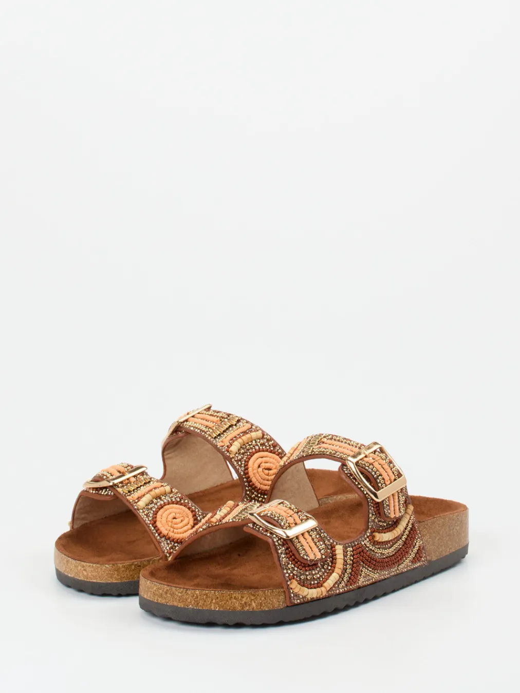 Diese Pantoletten verbinden Ethno-Design mit fußfreundlichem Komfort dank anatomisch geformtem Korkfußbett und hochwertigen Materialien.