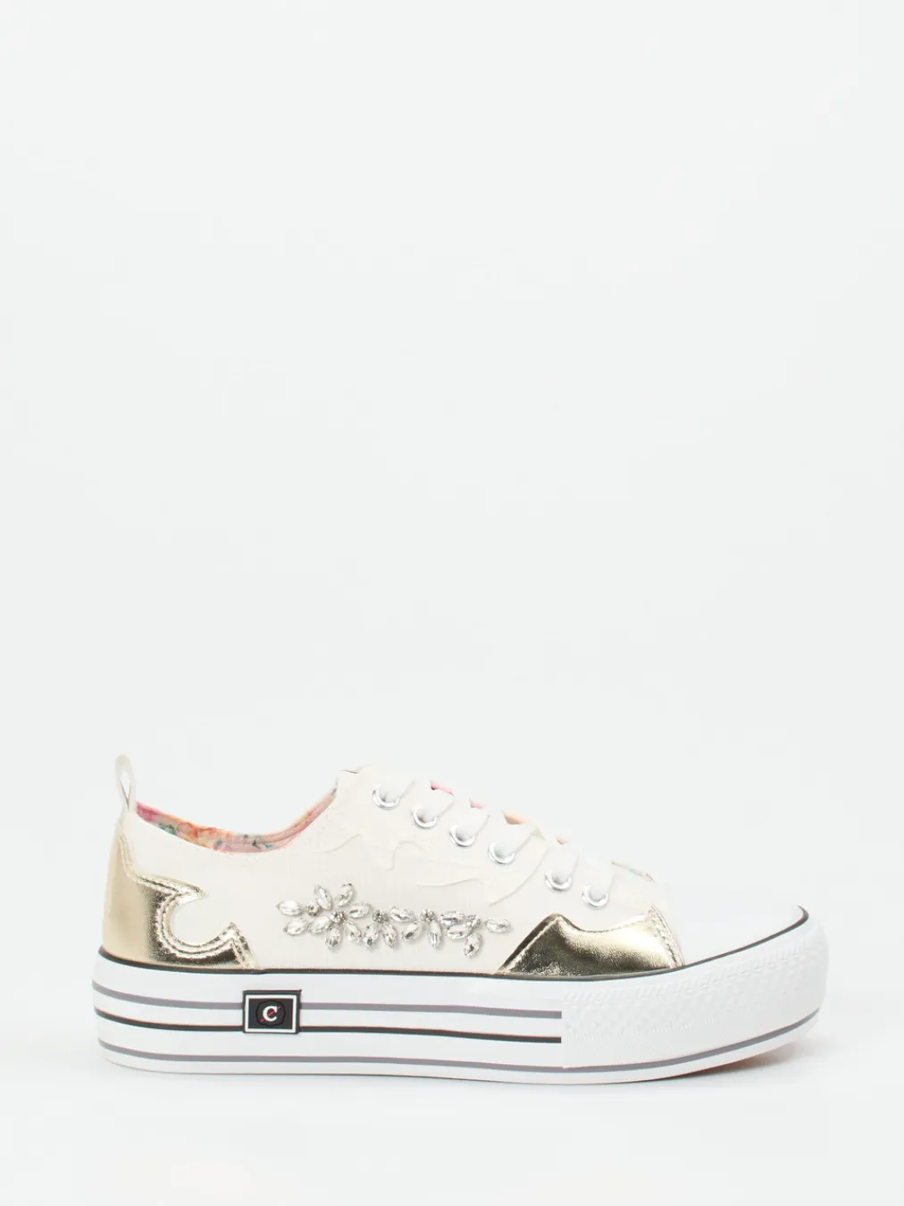 Eyecatcher mit Glam-Faktor.Die Marke CAFèNOIR präsentiert einen modernen Damen-Plateau-Sneaker mit auffälligem Y2K-Charme. Für ausdrucksstarke Styles im Alltag oder beim Ausgehen bietet sich dieser Sneaker mit 3 cm hohem Plateau an. Das weiße Textil-Obermaterial wird durch goldfarbene Metallic-Overlays und seitliche Strassapplikationen glamourös ergänzt. Die klassische Lowcut-Form mit Schnürung trifft auf eine gestreifte Gummisohle mit Fischgrätprofil. Das florale Innenfutter sorgt für einen verspielten Akzent. Streetwear-Ästhetik trifft hier auf modisches Trendgespür. Ein Statement-Sneaker mit CAFèNOIR-typischer Stilraffinesse.