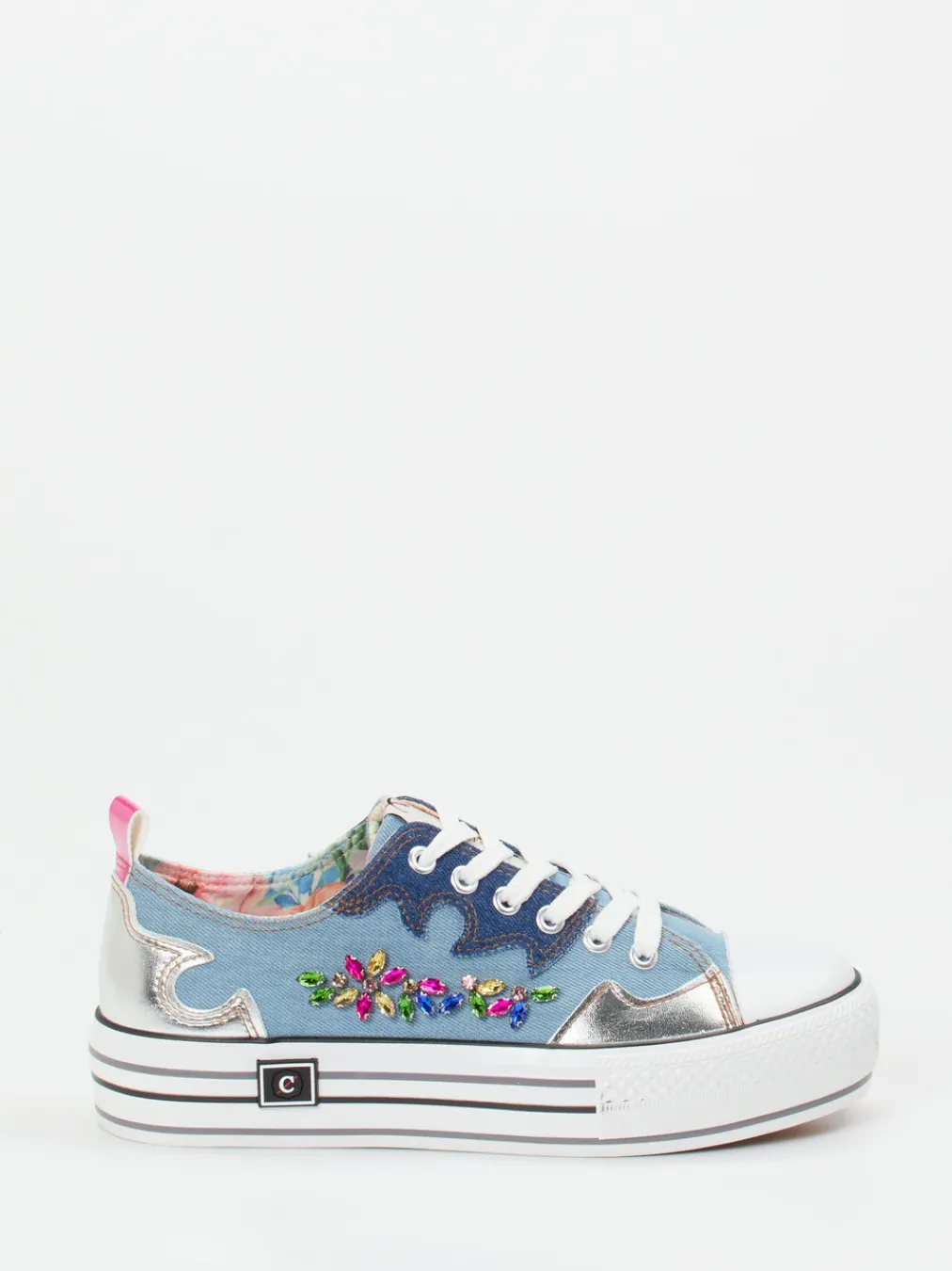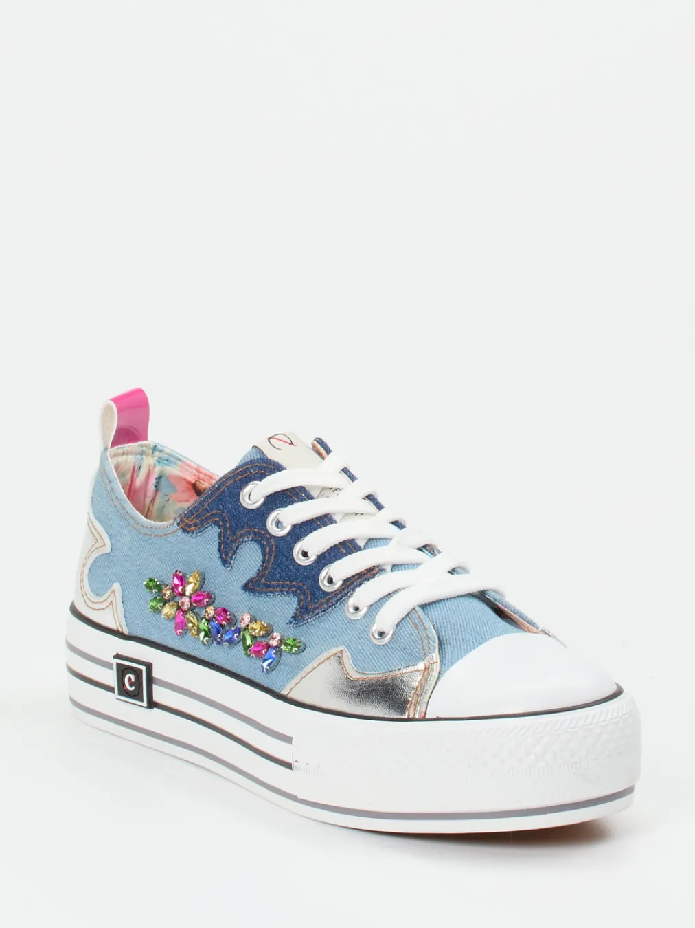 Statement für trendbewusste Citylooks.CAFèNOIR interpretiert den Damen-Plateausneaker expressiv und sommerlich. Für modische Freizeitmomente verbindet das Modell textiles Obermaterial in Jeansblau mit silberfarbenem Metallicleder und auffälligen Blumen aus bunten Strasssteinen. Die klassische Silhouette ist klar auf Streetstyle ausgelegt, ergänzt durch eine gepolsterte Innenausstattung mit geblümtem Textilfutter und ein komfortables Wechselfußbett. Farblich abgestimmte Schnürbänder, der 3 cm hohe Plateauabsatz sowie eine gestreifte Gummisohle im Fischgrät-Look sorgen für visuelle Dynamik. Ideal kombinierbar mit Denim oder Metallic-Accessoires. CAFèNOIR beweist Gespür für stilvolle Eyecatcher mit hohem Fashion-Appeal.