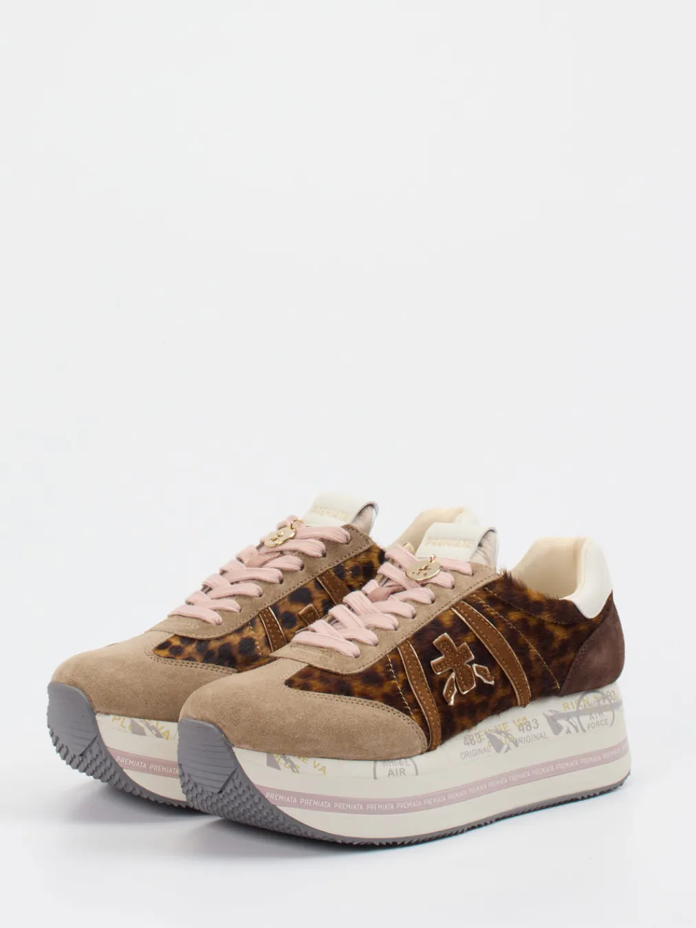 Animalprint trifft auf urbanen Stil.Premiata präsentiert einen Plattform-Sneaker für Damen, der mit modischer Raffinesse besticht. Ideal für ausdrucksstarke Streetstyle-Looks bei City-Ausflügen oder geselligen Abenden, setzt dieser Sneaker auf eine stilvolle Kombination aus Velour/Textil mit samtiger Fellstruktur. Der hellbraune Grundton, akzentuiert mit dunkelbraunem Leomuster und roséfarbenen Schnürsenkeln, verleiht dem klassischen Plateauprofil eine feminine Note. Goldfarbene Ösen und ein Sohlen-Branding runden das Design ab. Die griffige Gummisohle sorgt für Komfort im Alltag, während das Modell als Key-Piece aktueller Animalprint- und Plateau-Trends fungiert. Lässig kombinierbar zu Oversized-Pieces oder monochromen Styles. Ein markanter Eyecatcher von Premiata mit stilvollem Trendfaktor.