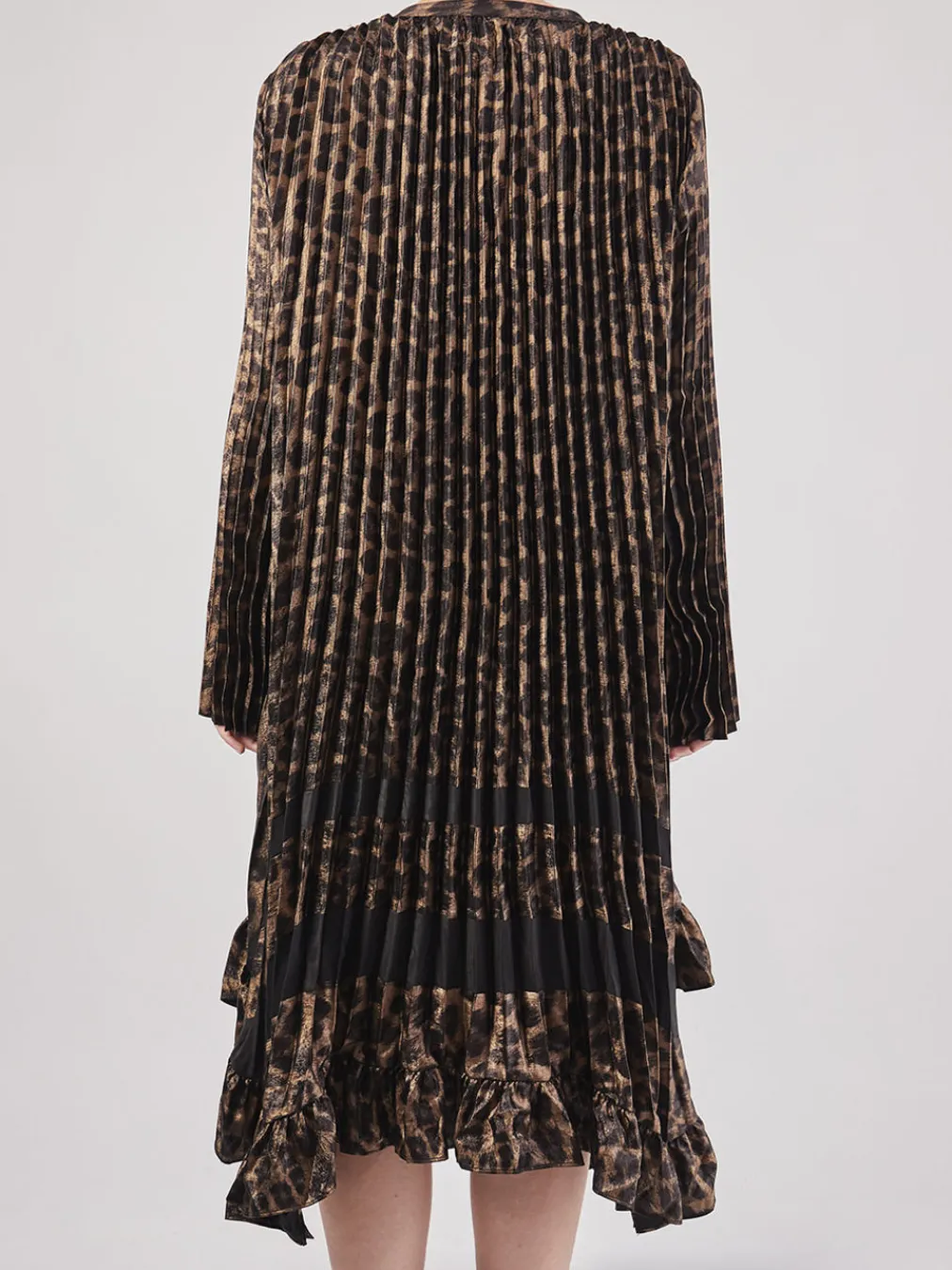Das plissierte Kleid von Yippie Hippie kombiniert glänzendes Textil mit trendigem Animalprint und changierender Oberfläche – ein modisches Statement mit Boho-Appeal.