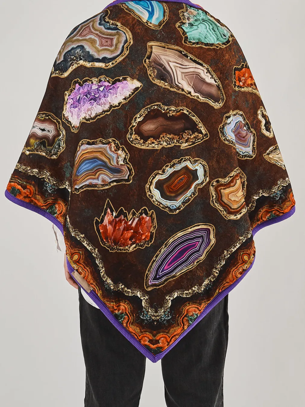 Dieser braune Poncho von Katherina Loretta ist ein stylishes Accessoire, das die Blicke auf sich zieht und an kühlen Tagen wärmt. Auf dem kuscheligen Textilmaterial wird ein aufwendiges Muster aus bunten Mineralien und Edelsteinen gezeigt. Abgeschlossen wird der Look mit der weichen Fütterung in einem leuchtendem Orange. Ein femininer Hingucker für Ihren Herbst und Winter! – Material: 80% Polyester, 20% Wolle – Maße: ca. 200 cm x 150 cm x 150 cm – Farbe: braun/bunt – Reinigung: Handwäsche