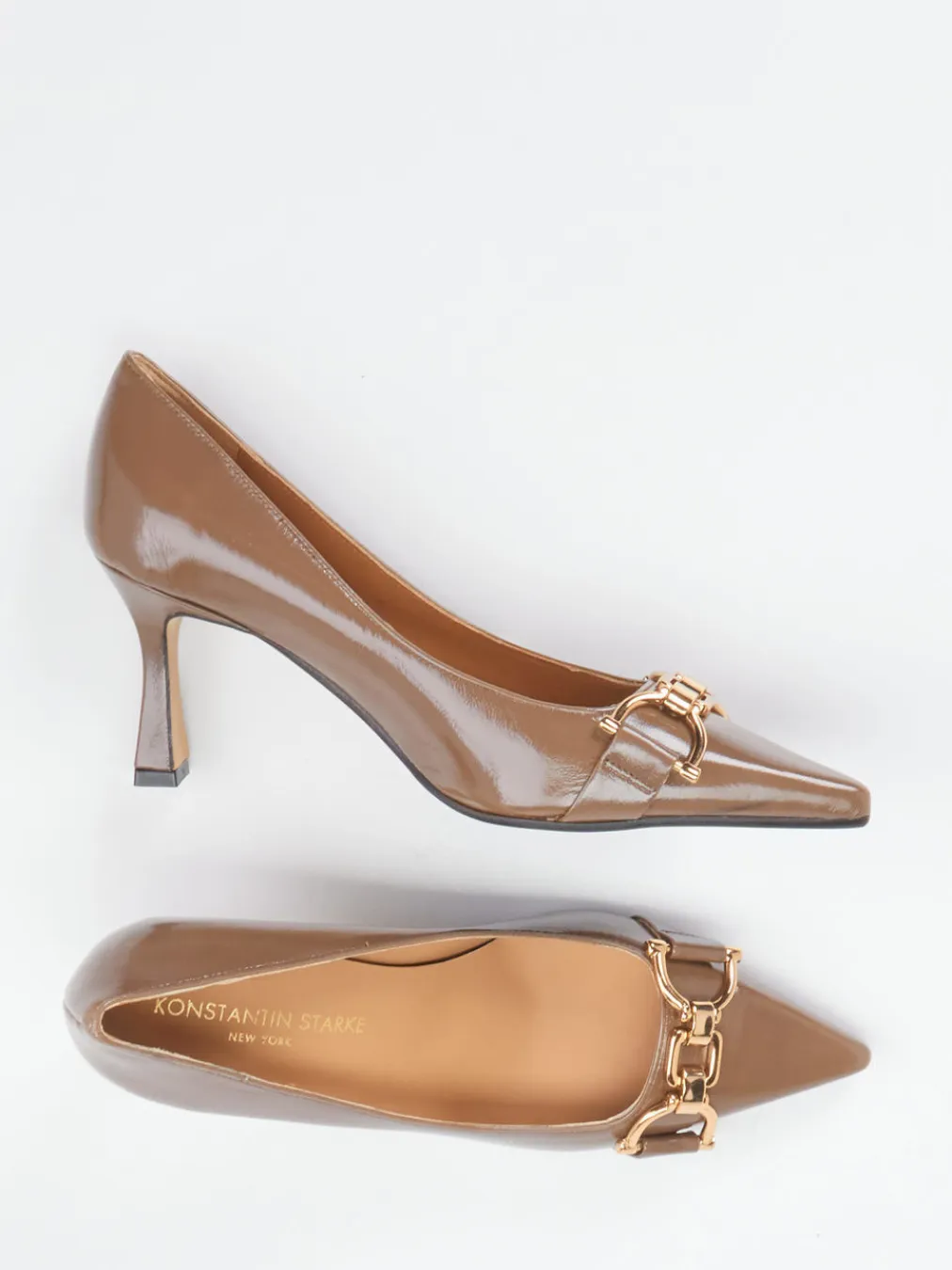 Stilvoller Auftritt mit ikonischen Details.Die Pumps von Konstantin Starke vereinen Eleganz und Handwerkskunst. Ideal für formelle Anlässe oder das Business-Outfit: Diese braunen Damenschuhe in glänzendem Lackleder fallen durch ihre klassische, spitz zulaufende Form und den 7 cm hohen Kitten Heel auf. Die goldfarbene Zierspange im Horsebit-Stil verleiht dem minimalistischen Design einen Hauch Vintage-Flair. Der gummierte Sohlenbereich sorgt für Trittsicherheit, das Ziegenlederfutter für angenehmen Komfort. Kombinierbar mit Seidenbluse und Lackledertasche in Cognac. Ein modisch zeitloser Begleiter mit elegant-reduzierter Aussagekraft.