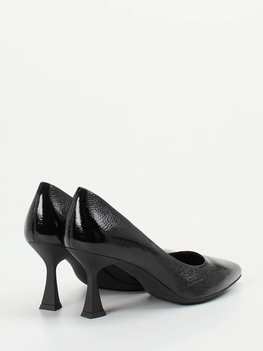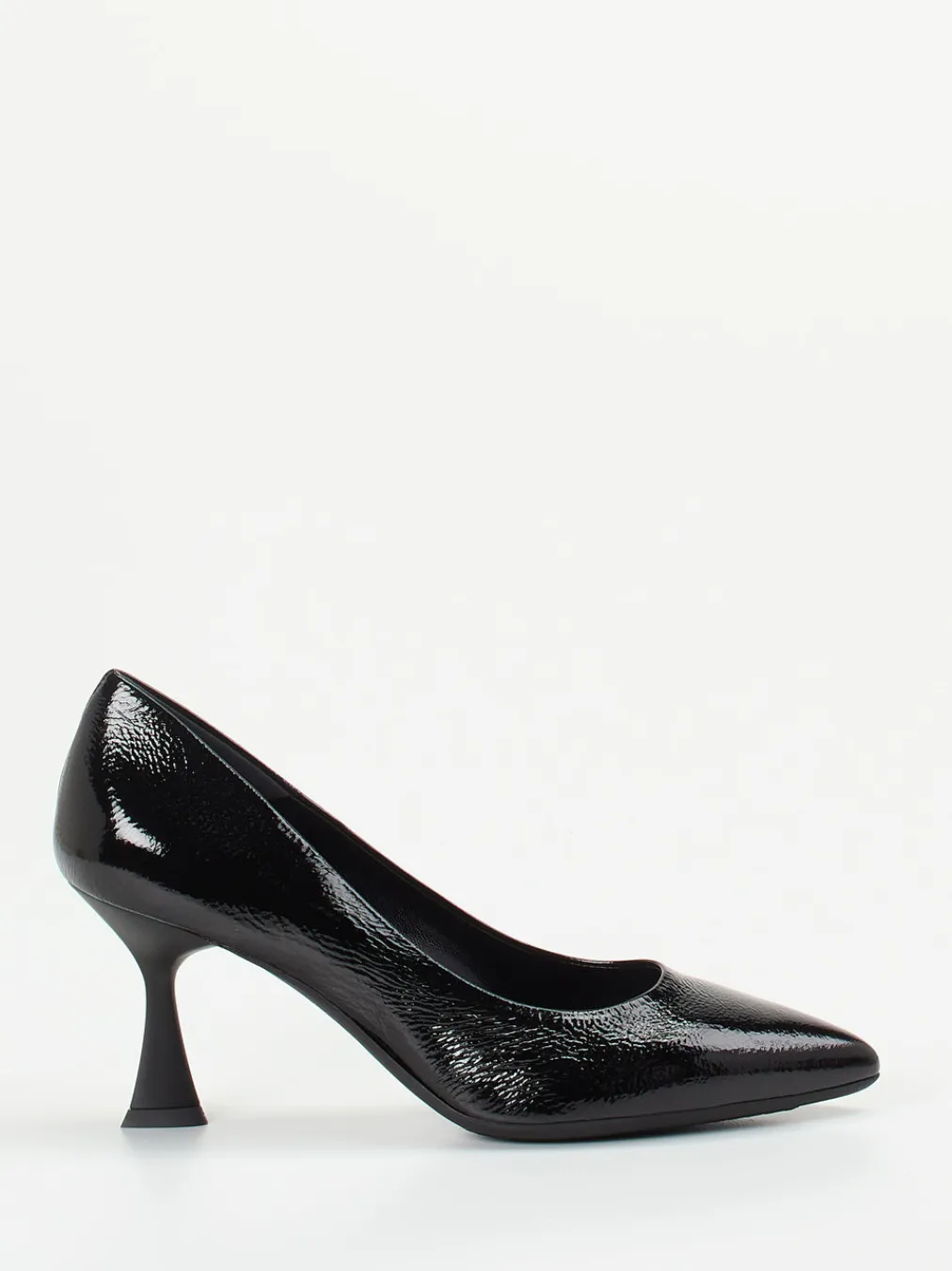 Ideal für besondere Anlässe oder stilvolle Abend-Events: Das spiegelnd glänzende, schwarze Lackleder und die spitz zulaufende Silhouette verkörpern puristische Eleganz. Der skulpturale, kantige Absatz setzt ein modernes Design-Statement und verleiht dem Modell eine besondere architektonische Note. Eine weich gepolsterte Innensohle aus Ziegenleder sorgt für ein angenehmes Laufgefühl, während die rutschfeste Gummisohle sicheren Stand garantiert. Im Trendfeld „Quiet Luxury“ positioniert, passt der Schuh ideal zum minimalistischen Tailoring oder zur schlichten Cocktailrobe.