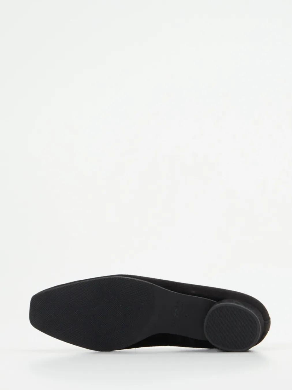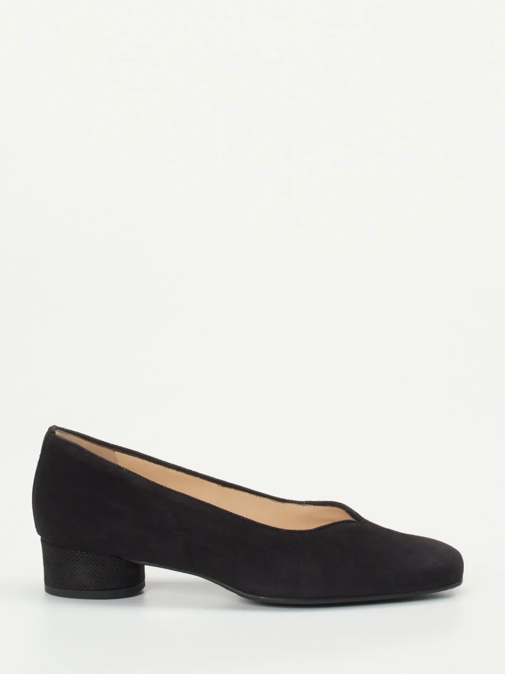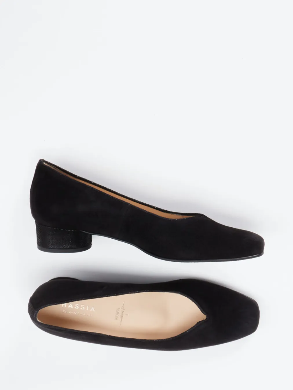 Eleganz im Alltag.Hassia präsentiert mit diesem Damen-Pumps ein Modell, das sich ideal für Büro und Alltag eignet. Der aus samtig mattem, schwarzen Veloursleder gearbeitete Schuh überzeugt durch seine klassische Form mit leicht geschwungenem V-Ausschnitt und einem komfortablen Blockabsatz mit strukturierter Oberfläche. Das hochwertige Lederfutter und das gepolsterte, herausnehmbare Fußbett bieten ein angenehmes Tragegefühl – auch bei längeren Tagen. In Ton-in-Ton-Optik gehalten, verkörpert der Pumps minimalistischen Chic und folgt dem Trend des „Quiet Luxury“. Die griffige Gummisohle erhöht die Alltagstauglichkeit zusätzlich. Komfort und Stilkompetenz im typischen Hassia-Design.