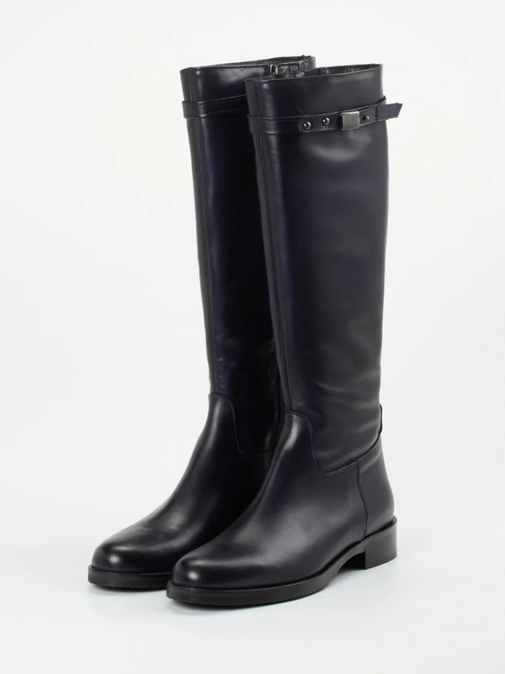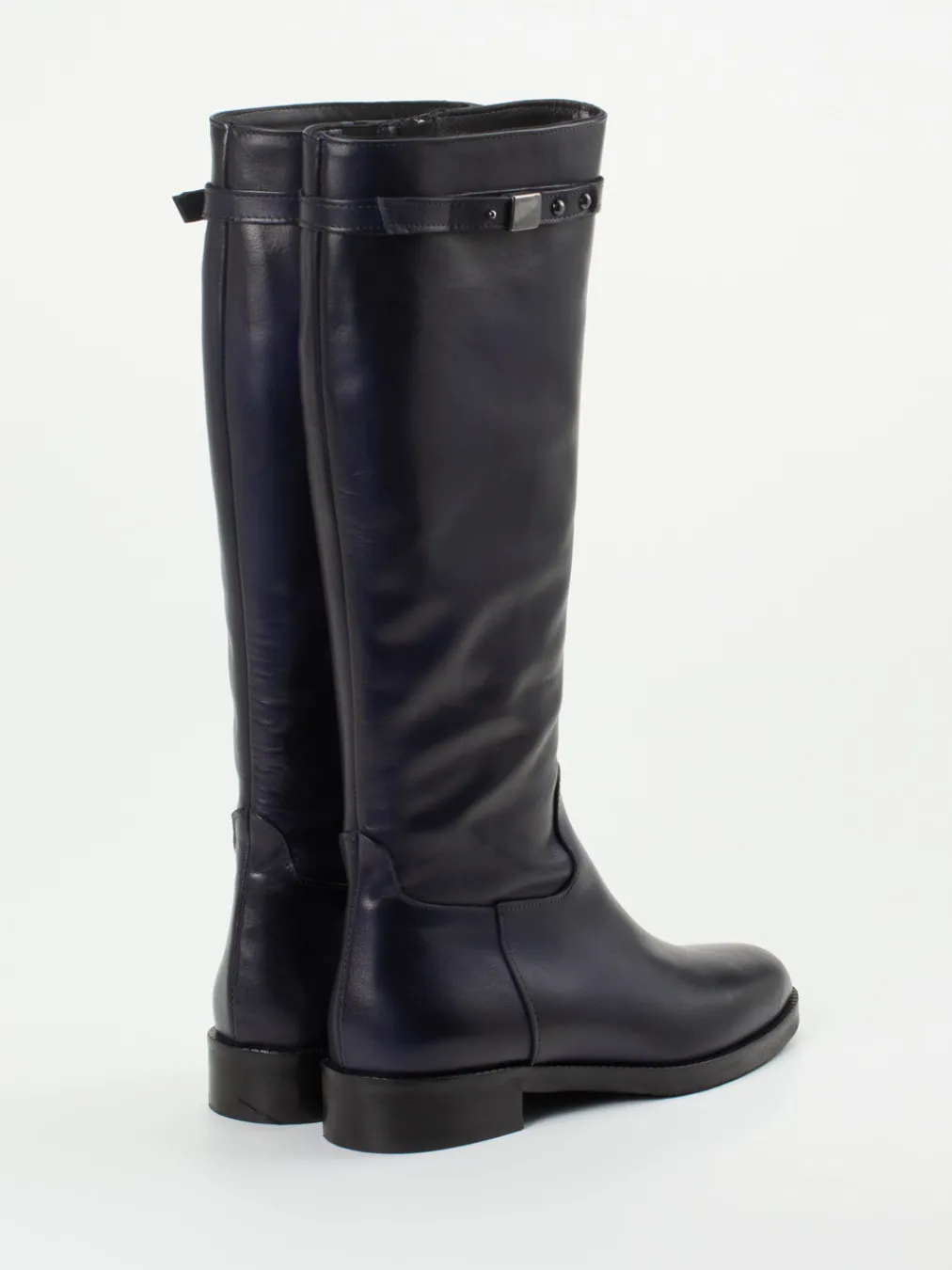 Stilvoll durch die kühle Jahreszeit.Andrea Puccini interpretiert den klassischen Damen-Reitstiefel neu. Perfekt für elegante Alltagsmomente zeigt sich dieser exquisit verarbeitete Stiefel aus tiefblauem, geschmeidigem Kalbleder mit glänzender Oberfläche. Die schmal zulaufende Silhouette erhält durch einen Innenreißverschluss und eine dekorative Zierschnalle am Schaftabschluss formale Raffinesse. Die profilierte Gummisohle sorgt für sicheren Halt, während das gepolsterte Lederfußbett Komfort verspricht. Harmonisch fügt sich das Design in stille Luxus-Trends wie Quiet Luxury und Equestrian Chic ein. Ideal kombinierbar mit langen Mänteln oder schmalen Wollhosen. Ein stilvolles Statement, das Tradition und Moderne elegant vereint.