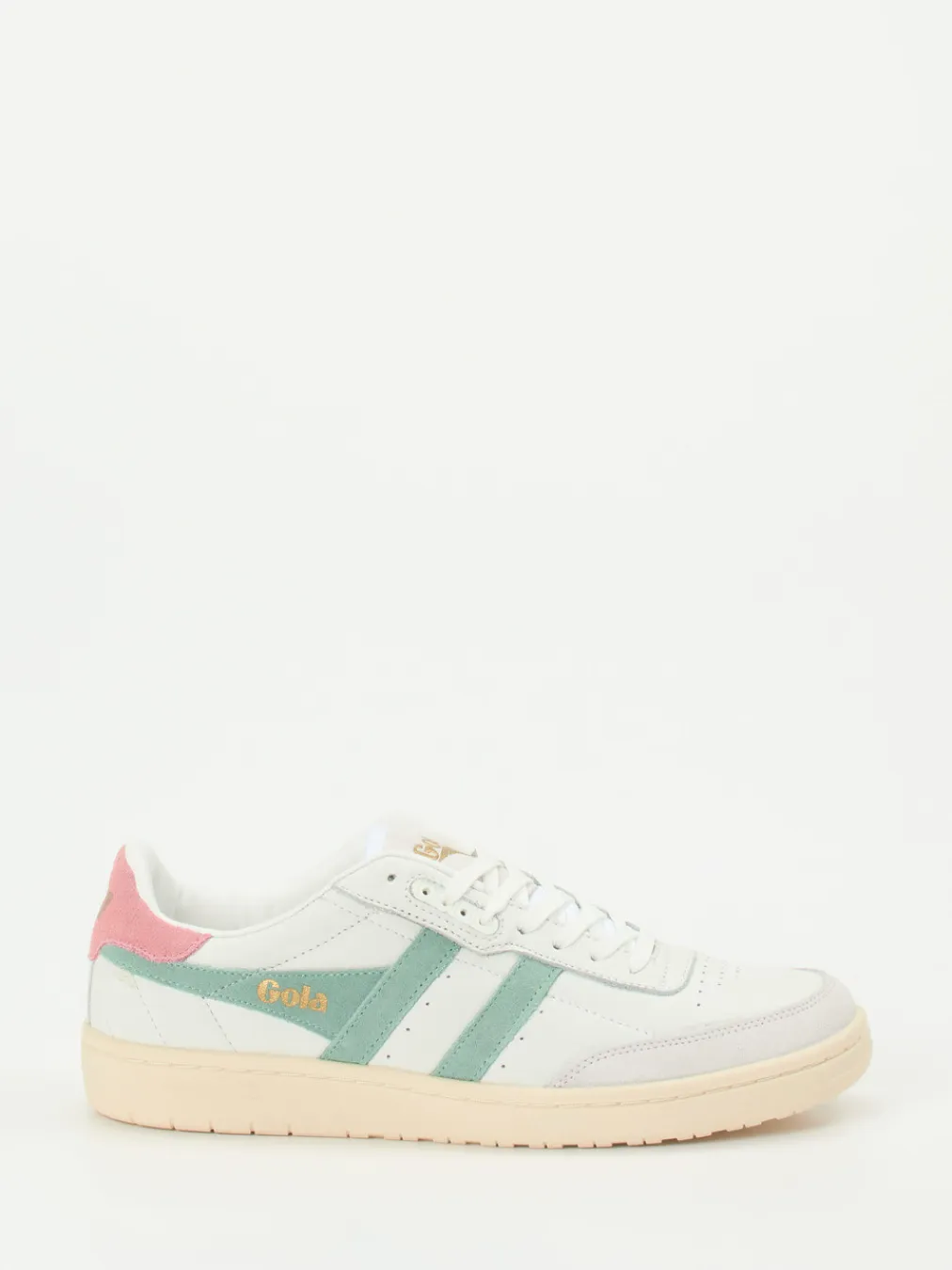 Retro trifft Moderne: Der Leder-Sneaker von Gola überzeugt durch nostalgisches Design, hochwertige Verarbeitung und trendige Pastellakzente.