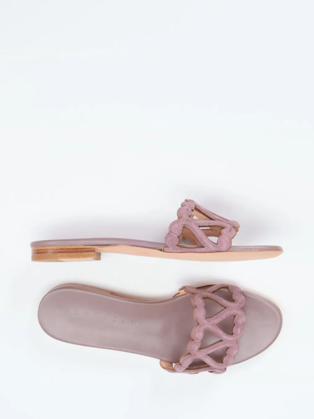 Feines Veloursleder und eine dekorative Riemenführung vereinen sich hier zu minimalistischem Boho-Chic. Die flache Form unterstreicht Leichtigkeit und Komfort.