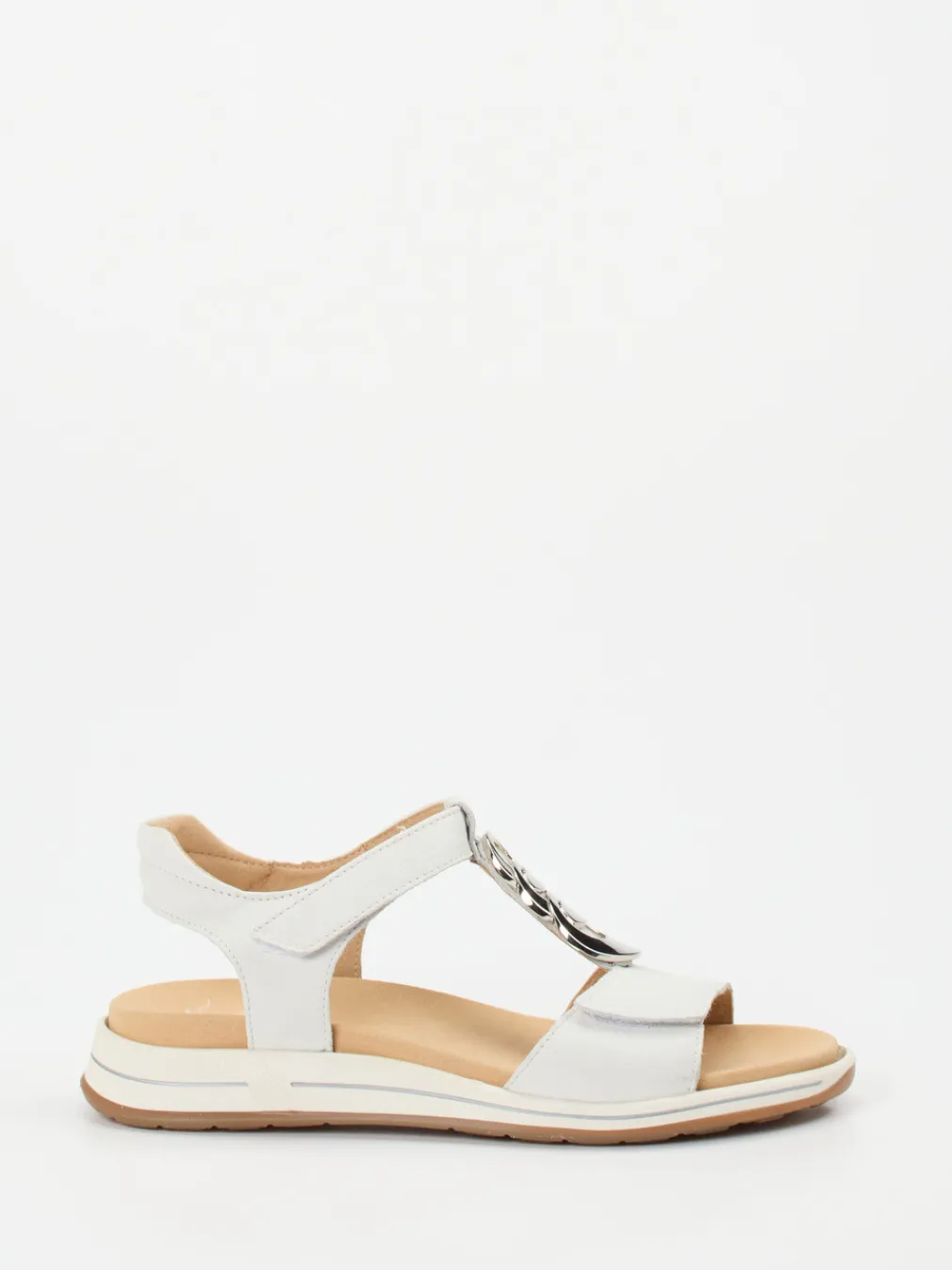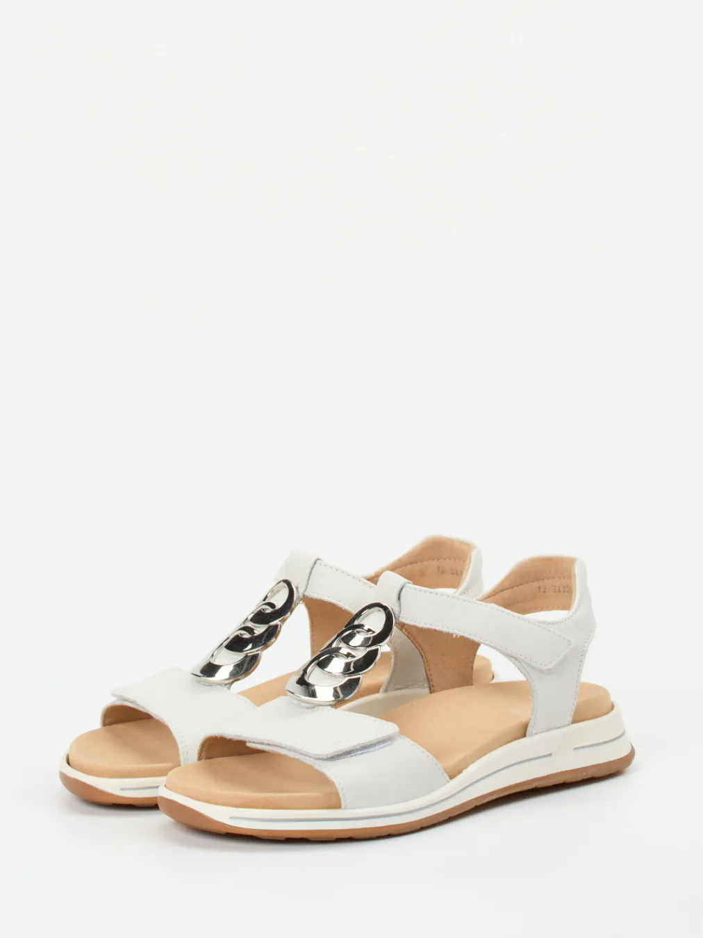 Eleganz trifft Ergonomie in Off-White.Die Marke Ara präsentiert eine stilvolle Komfortsandale für Damen. Das Modell kombiniert Alltagstauglichkeit mit einem minimalistischen Design. Für entspannte Stunden unterwegs sorgt das hochwertige Kalbleder mit natürlicher Narbung und glatter Oberfläche. Die Sandalette zeigt sich in edlem Off-White, akzentuiert mit einer silberfarbenen Kettendekoration und Ton-in-Ton-Nähten. Zwei Klettverschlüsse ermöglichen einfache Handhabung und individuelle Anpassung. Die ergonomisch geformte Gummisohle mit rutschhemmendem Profil und das gepolsterte, waschbare Fußbett bieten ein spürbares Komfortplus. Ein zeitgemäßes Detail: das auswechselbare Fußbett – ideal für eigene Einlagen. Ara steht für durchdachten Komfort mit stilsicherer Wirkung.