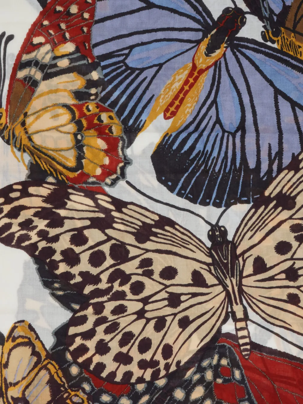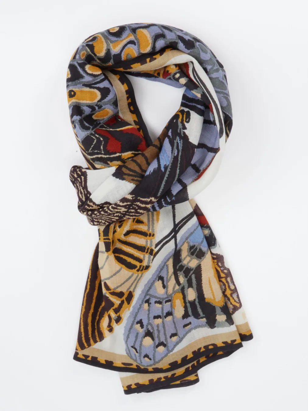 Leichter Wollschal mit kunstvollem Schmetterlingsdesign in warmen Farbtönen – eine stilbewusste Wahl für Freizeit-Ensembles und saisonale Trend-Looks.