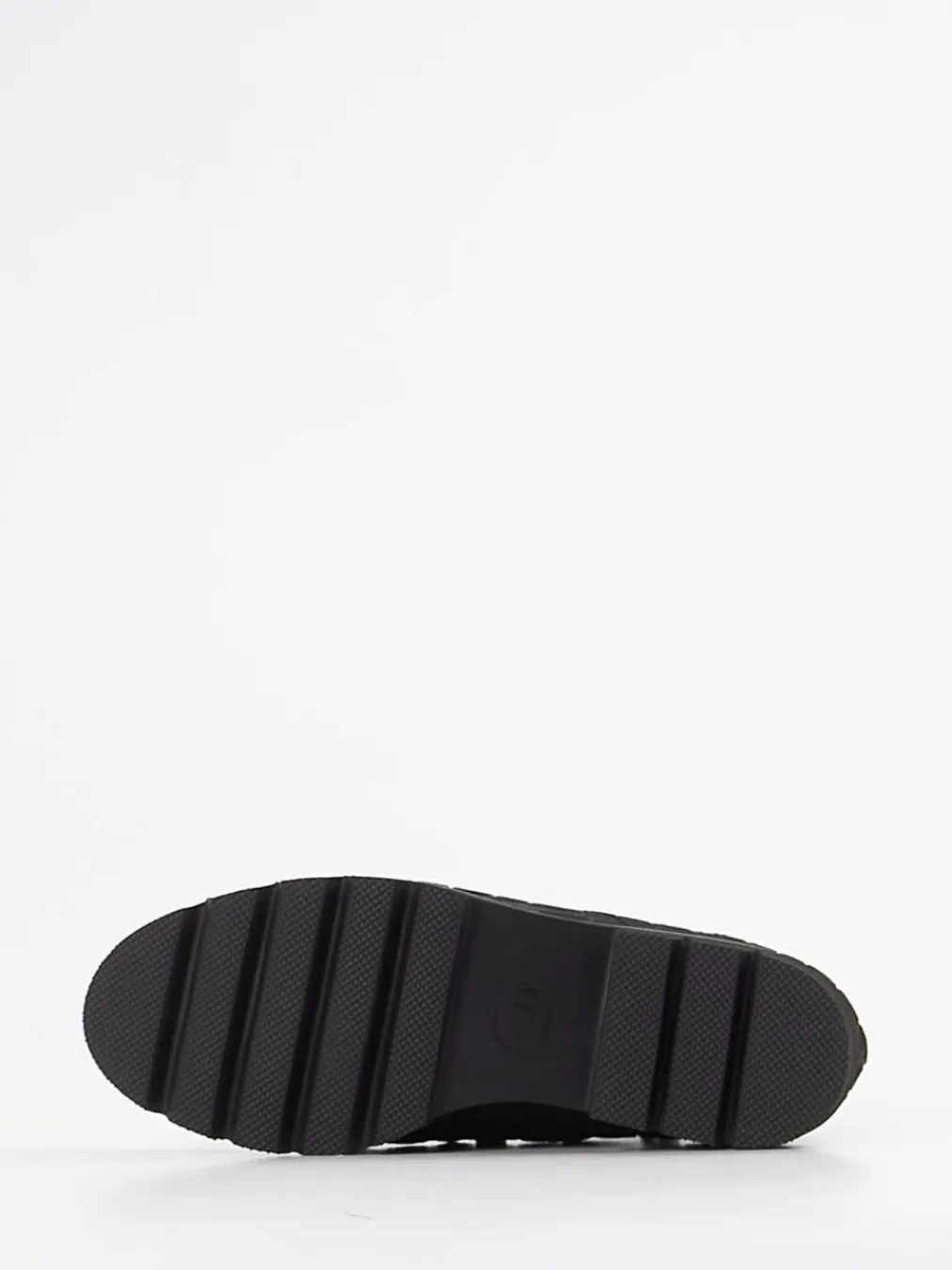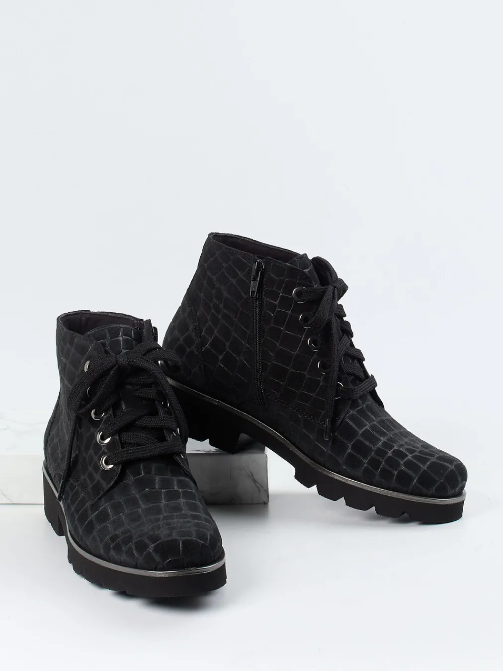 Herbsttauglich, robust und stilbewusst.Christian Dietz präsentiert mit diesen Schnürboots eine komfortbetonte Damen-Stiefelette. Für regnerische Herbsttage und urbane Streifzüge gemacht, zeigt sich das Modell in tiefschwarzem Veloursleder mit markanter Krokoprägung. Die matt texturierte Oberfläche, kombiniert mit silberfarbenen Ösen und einer dezent kontrastierenden Profilsohle, verleiht dem kompakten, knöchelhohen Design einen modernen Streetwear-Akzent. Schnürung und seitlicher Reißverschluss sorgen für sicheren Halt und einfaches Anziehen. Das herausnehmbare Fußbett sowie die leichte Gummisohle fördern eine bequeme Passform und Alltagstauglichkeit. Optimal für Casual-Looks mit Utility-Charakter – lässt sich hervorragend mit Steppjacke und Crossbody Bag kombinieren. Hochwertiger Tragekomfort trifft auf markengerechte Designkompetenz.
