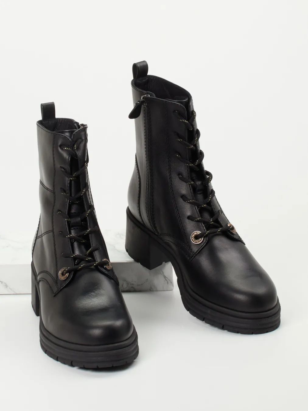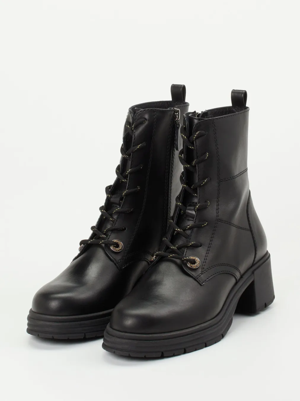 Ob für den Stadtbummel oder abends im Lieblingscafé – die Kombination aus goldfarbenen Metallösen, dezent glänzenden Schnürsenkeln und markanter Profilsohle macht dieses Design zum stilvollen Alltagsbegleiter. Glatt verarbeitetes Kalbleder mit matter Oberfläche verleiht der knöchelhohen Silhouette eine klare Linienführung, der 4 cm hohe Blockabsatz bringt komfortable Höhe. Funktionale Akzente wie der seitliche Reißverschluss und eine praktische Zuglasche runden den Look ab. Perfekt zu Cropped Jeans oder Strickkleidern.