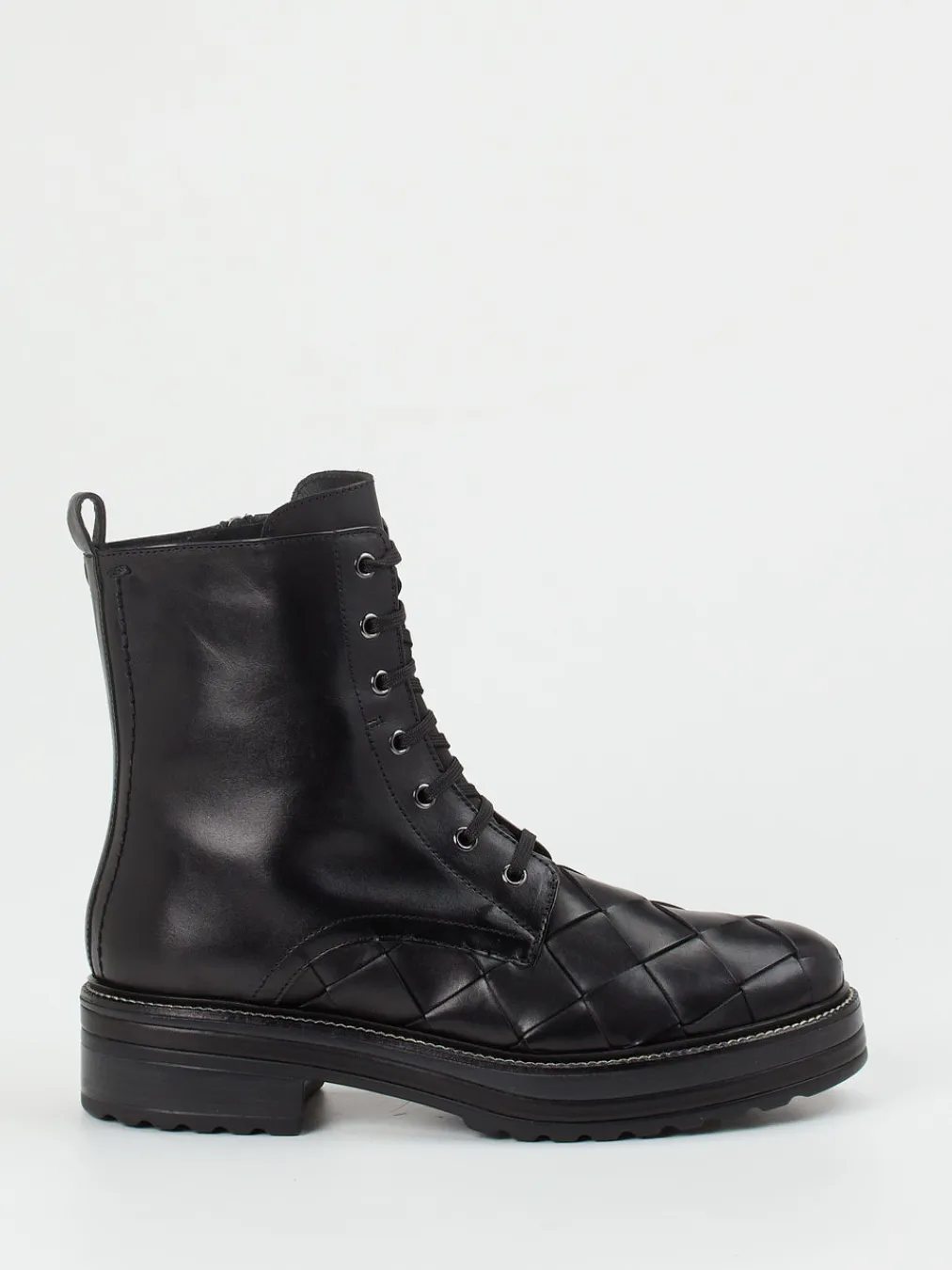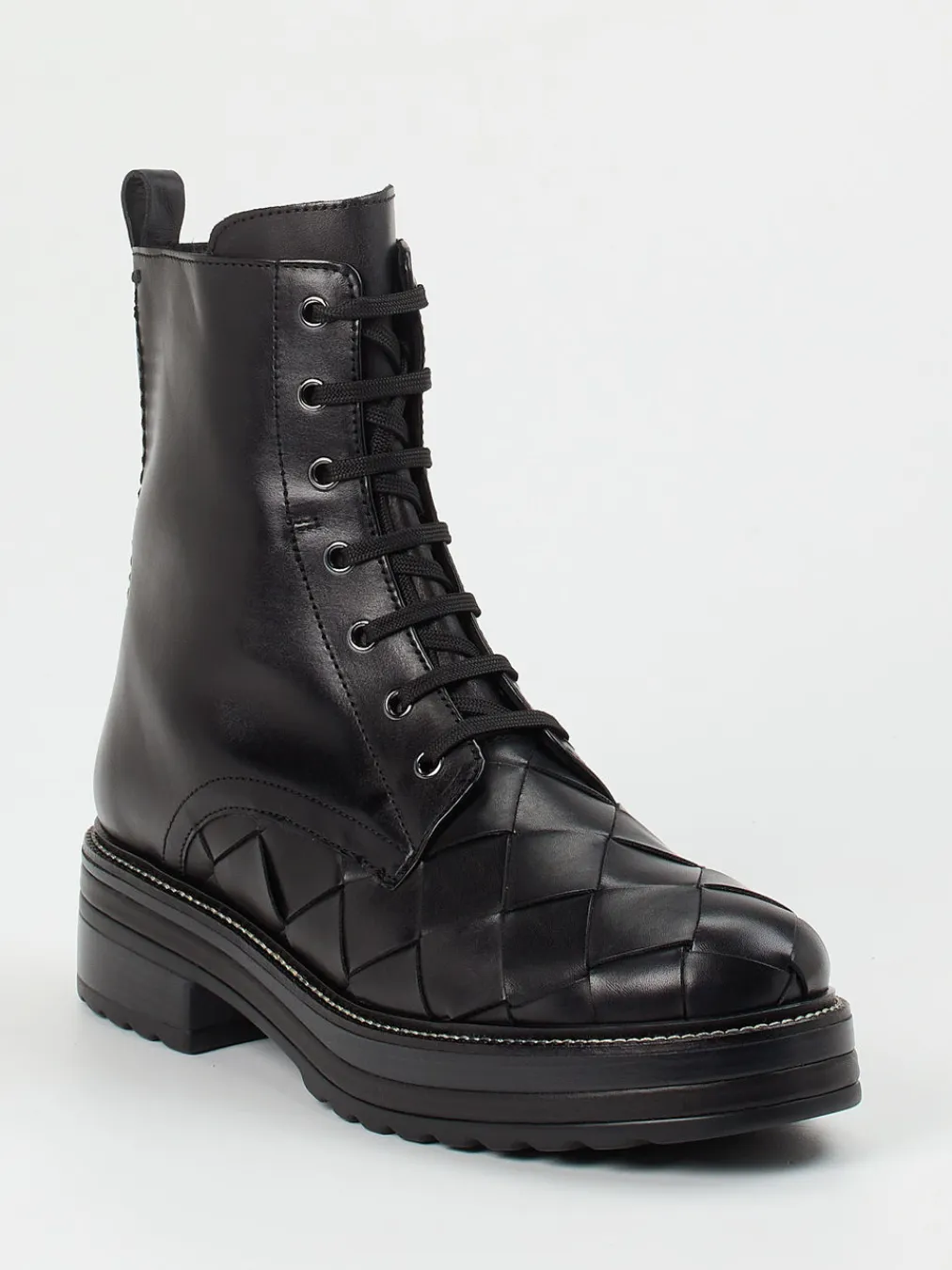 Steppung mit urbanem Charakter.Die Marke Pons Quintana präsentiert mit dieser Damen-Stiefelette ein stilvolles Modell für Herbst und Winter. Ideal für den Weg ins Büro oder einen Stadtbummel: Das schwarze Kalbleder zeigt sich in glänzender Optik und auffälliger Steppung im Rautenstil auf dem Vorfuß. Die Kombination aus Schnürung und seitlichem Reißverschluss sorgt für Komfort und sicheren Halt. Eine kräftig profilierte Gummisohle verleiht Standfestigkeit, während tonale Nähte und ein minimalistisches Design die modische Aussage unterstreichen. Die knöchelhohe Silhouette passt zu schmalen Hosen und Materialien mit Struktur. Ein alltagsfähiger Statement-Boot im Sinne von „Quiet Luxury“ – hochwertig gefertigt und ästhetisch souverän.