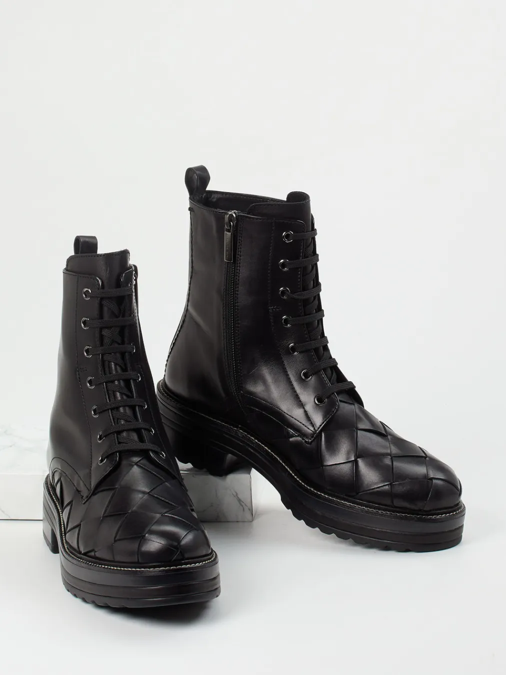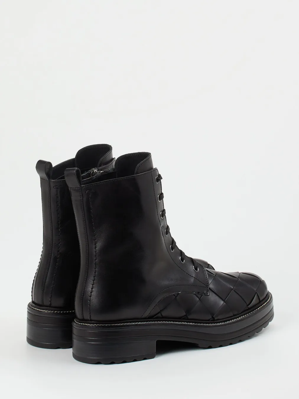 Die schwarz glänzenden Schnürboots vereinen luxuriöse Steppdetails mit Alltagstauglichkeit durch robuste Gummisohle und praktischen Reißverschluss.