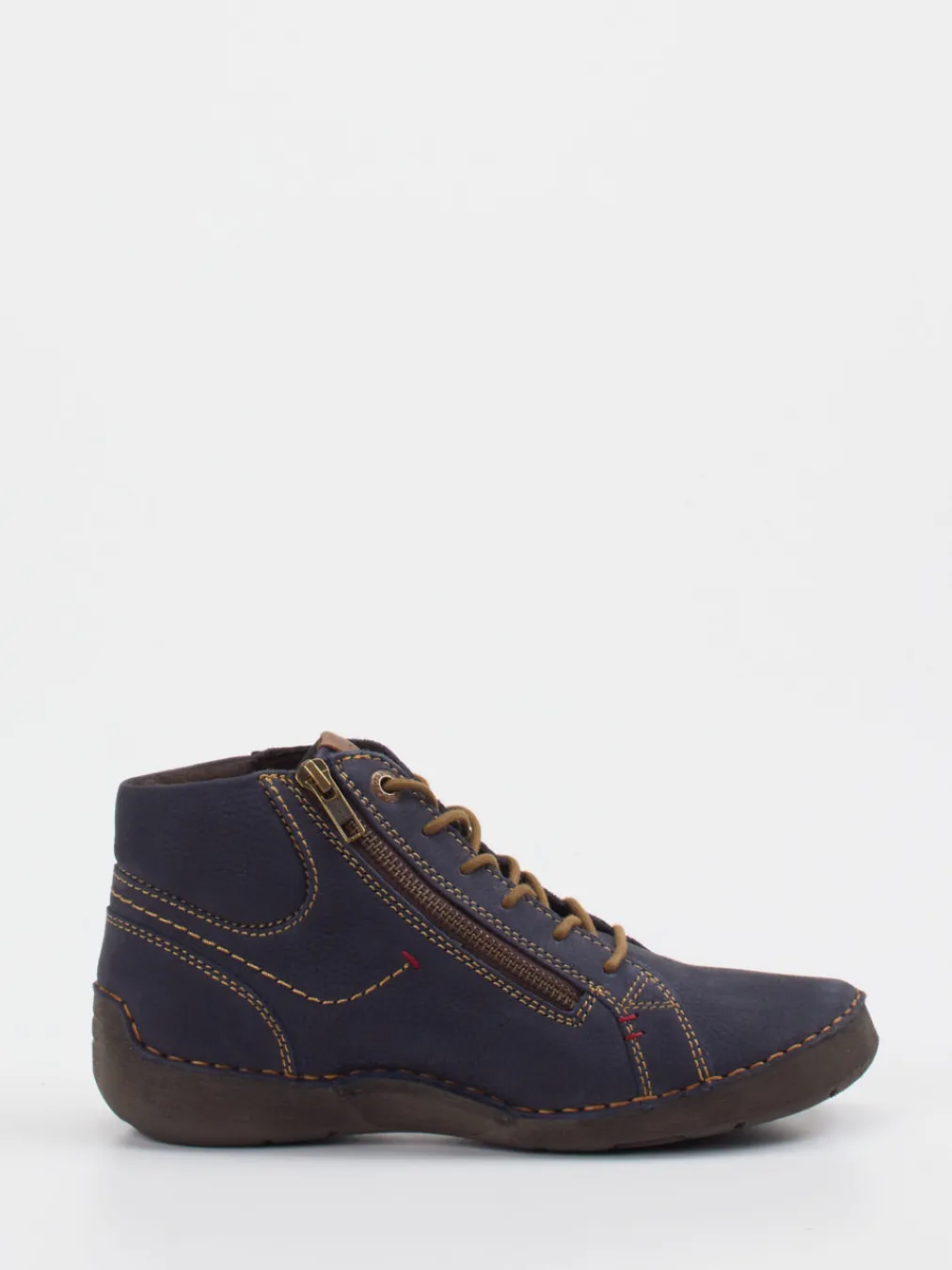 Bequem durch Herbst und Winter.Die Damen-Schnürstiefelette von Josef Seibel überzeugt als komfortorientiertes Casual-Modell für Alltag und Freizeit. Das genarbte Nubukleder in Dunkelblau verleiht der knöchelhohen Form eine natürliche Optik, unterstützt durch farblich abgesetzte Kontrastnähte in Cognac und Rot. Reißverschluss und Schnürung bieten Flexibilität beim Einstieg. Eine weiche Gummisohle mit hexagonalem Profil sorgt dabei für guten Halt, auch auf feuchtem Laub. Als Trendpiece der „Komfort-Revival“-Linie punktet der Stiefel mit reparaturfreundlicher Sohle und Slow-Fashion-Ausrichtung. Harmoniert hervorragend mit Thermo-Leggings und Wolljacken. Langlebige Materialien und funktionales Design für einen mühelos stilvollen Auftritt.