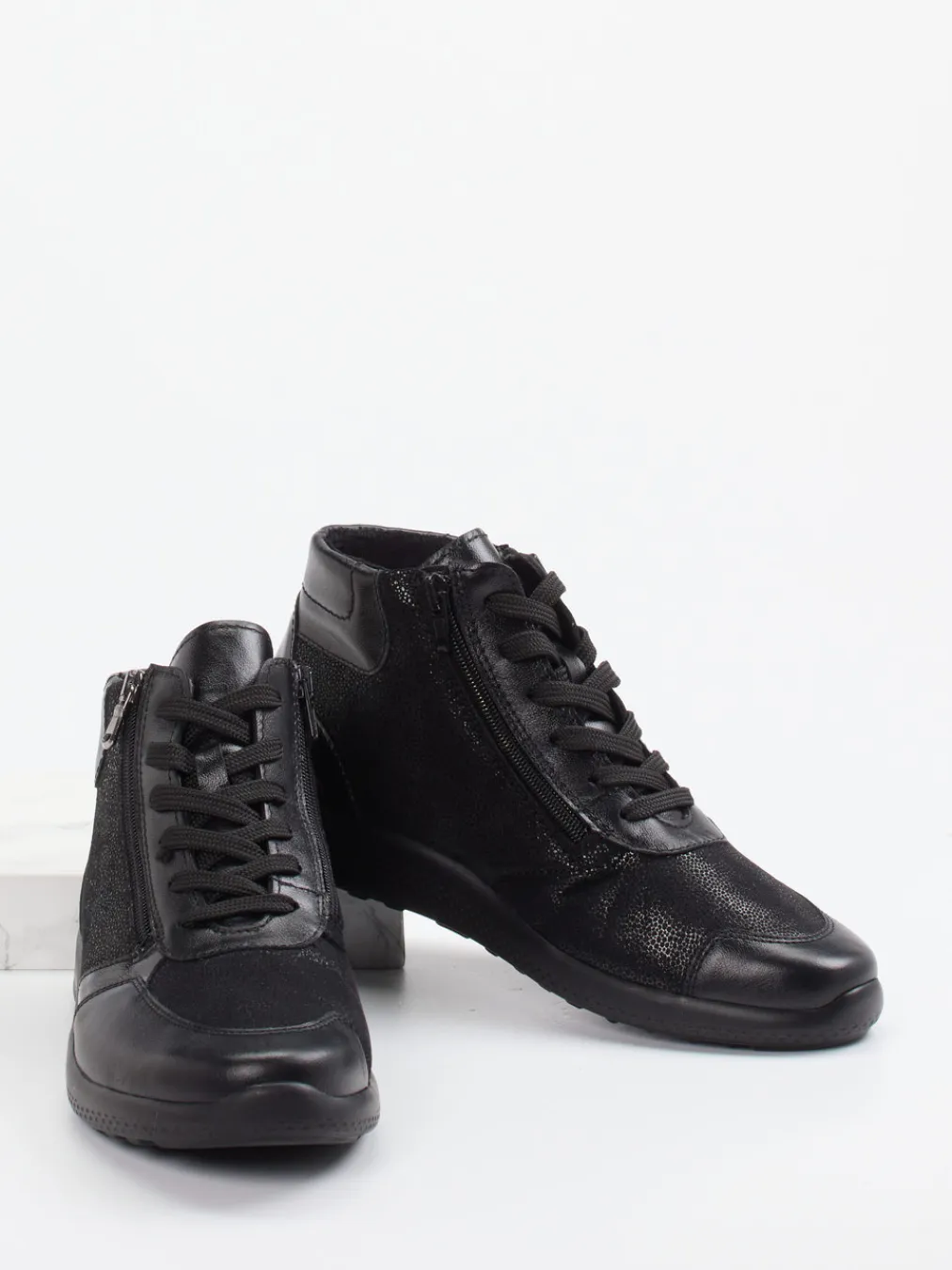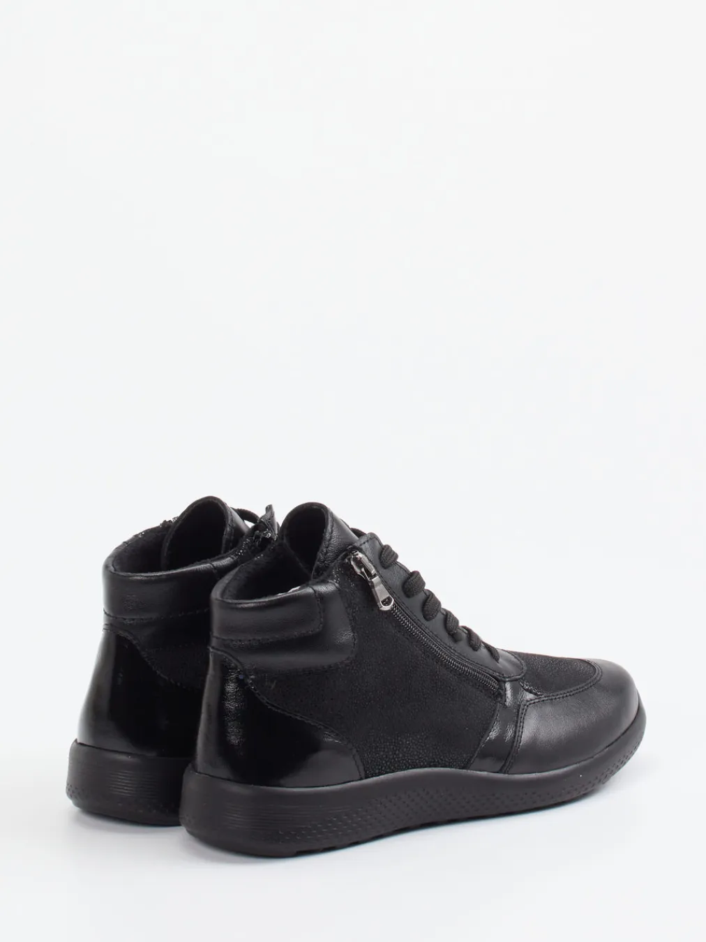 Für entspannte Tagesausflüge oder den Stadtbummel bei Herbstwetter bietet das Modell mit Stretchleder-Oberfläche, ergänzt durch feinsamtiges Velours- und glänzendes Kalbsleder, besten Tragekomfort. Die schwarze Farbgebung wird durch dezente Glanzeffekte und eine rund zulaufende, knöchelhohe Silhouette unterstrichen. Reißverschluss und Schnürung erleichtern den Einstieg; das microfasergefütterte Innere mit Soft-Fußbett in Weite K verspricht eine angenehme Passform. Die flexible PU-Profilsohle sorgt für guten Halt im urbanen Alltag und passt ideal zum „Quiet Luxury“-Trend.