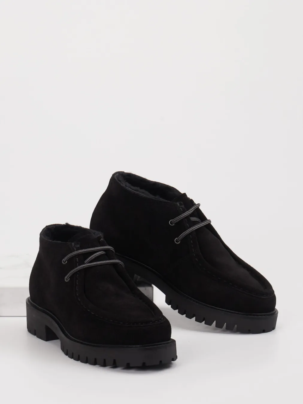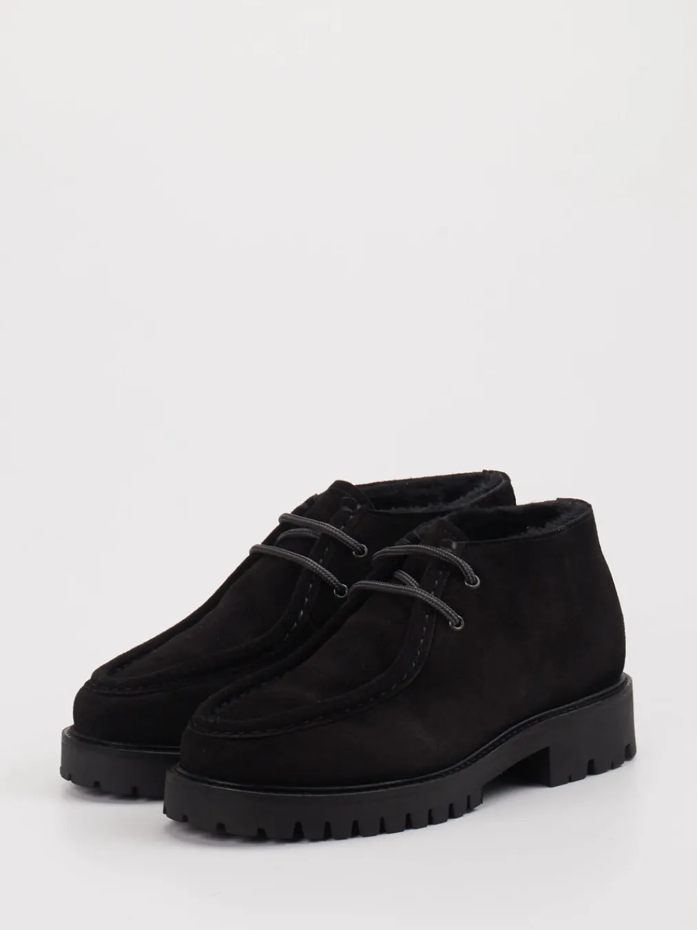 Diese Desert Boots aus schwarzem Veloursleder vereinen urbanen Minimalismus mit robuster Outdoortauglichkeit – perfekt für den Herbst in der Stadt.