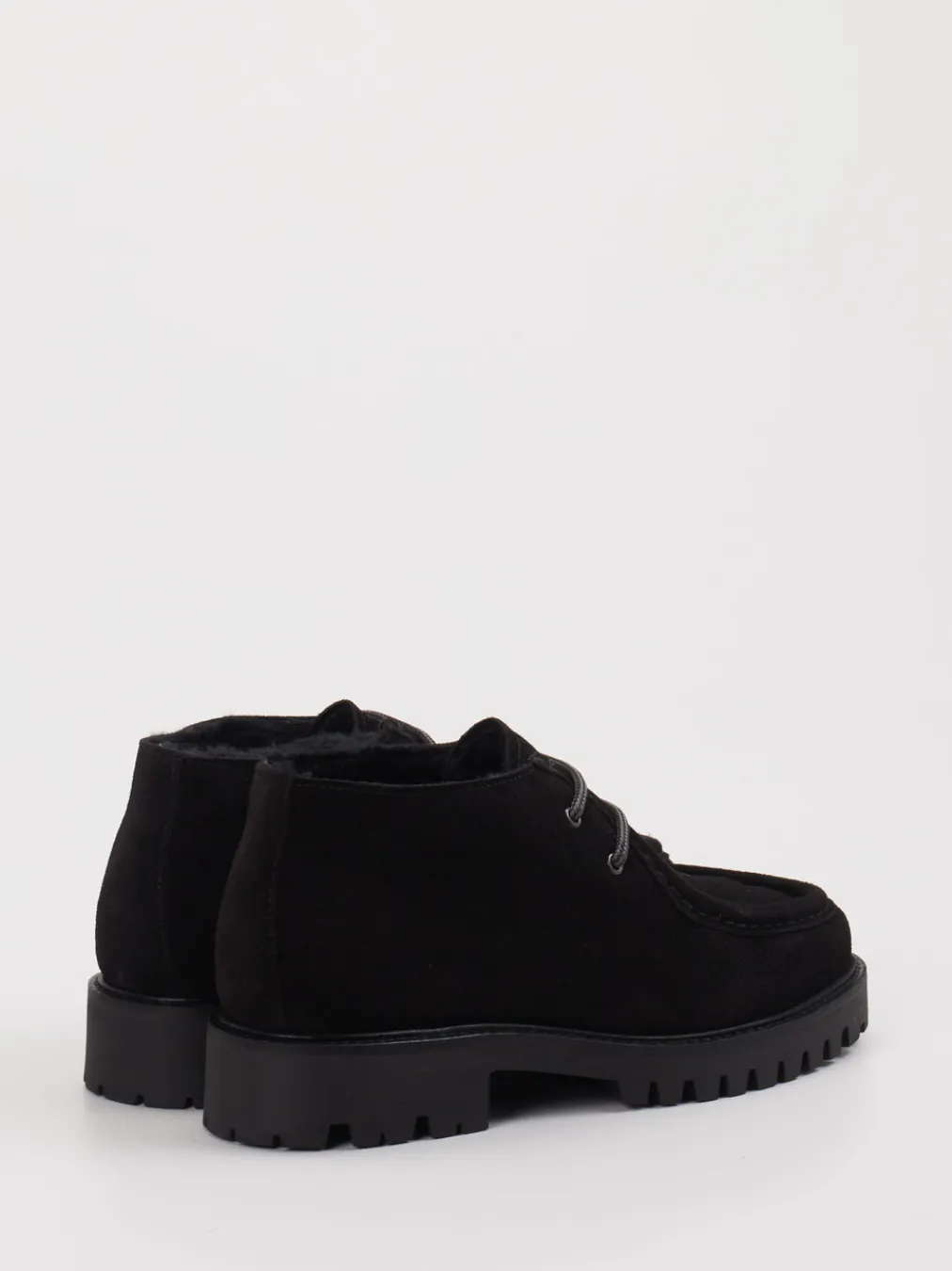 Urbaner Charme mit Outdoor-Profil. Konstantin Starke präsentiert eine hochwertige Schnürstiefelette, die Funktion und Stil vereint. Ideal für kühle Tage, bietet das Modell dank weichem Lammfellfutter angenehme Wärme. Das schwarze Veloursleder mit matter Oberfläche unterstreicht den minimalistischen Look, während Ton-in-Ton-Nähte und schwarze Metallösen dezente Akzente setzen. Die profilierte Gummisohle verleiht Trittsicherheit – ein zuverlässiger Begleiter im urbanen Alltag mit Outdoor-Bereich. Die klassische, runde Silhouette wirkt zeitlos und ergänzt lässige Herbst-Outfits, etwa mit Cargohose und Overshirt. Ein authentisches Statement für Komfort und urbanen Stil mit herbstlicher Haltung.