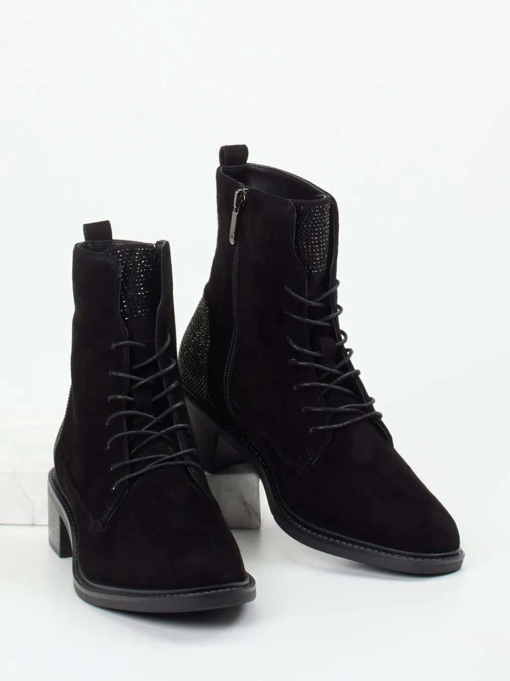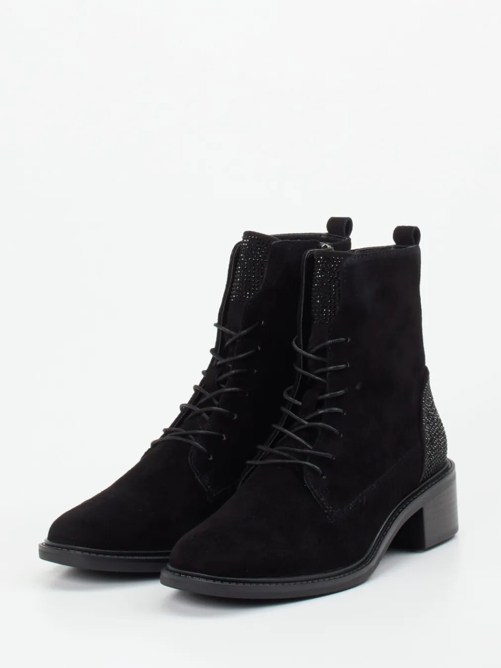 Die feminine Schnürstiefelette kombiniert softes Veloursleder mit dezenten Glitzerakzenten – ideal für stilbewusste Looks im Alltag oder am Abend.