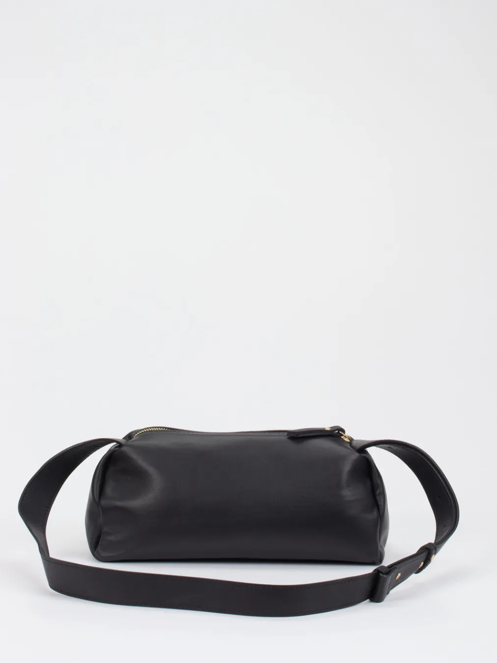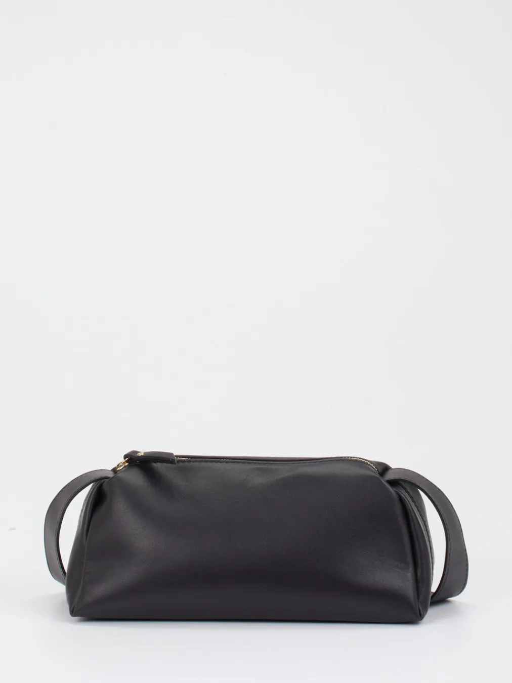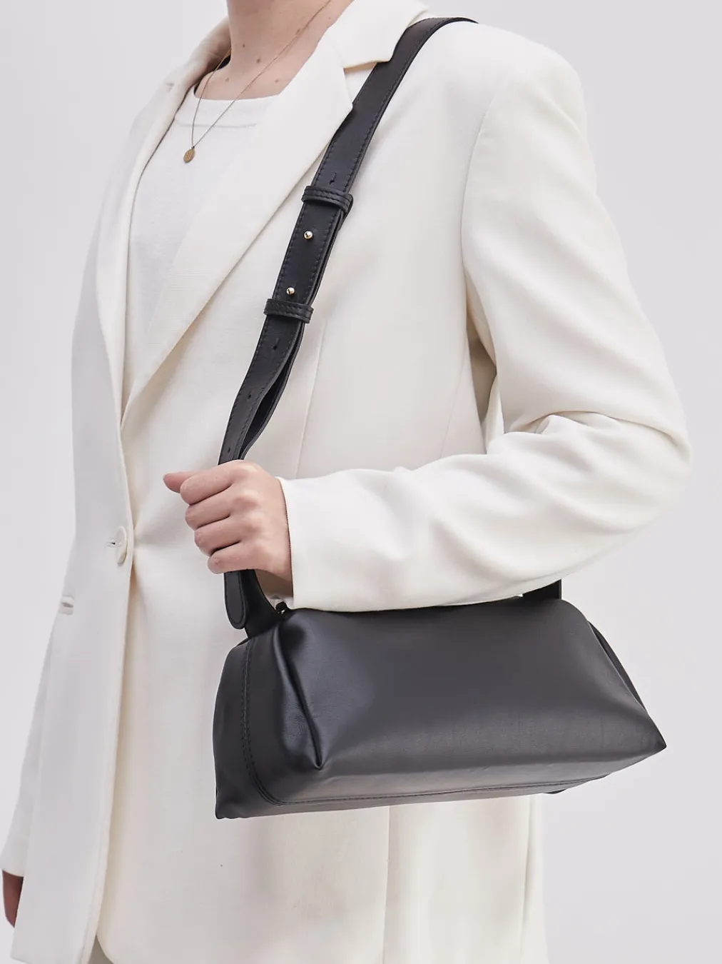 Die Baguette Bag von Konstantin Starke verbindet weiches Lammleder mit minimalistischer Linienführung. Goldfarbene Details setzen dezente Akzente im monochromen Design.