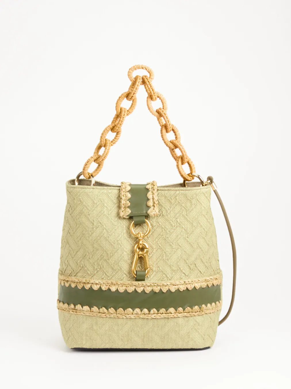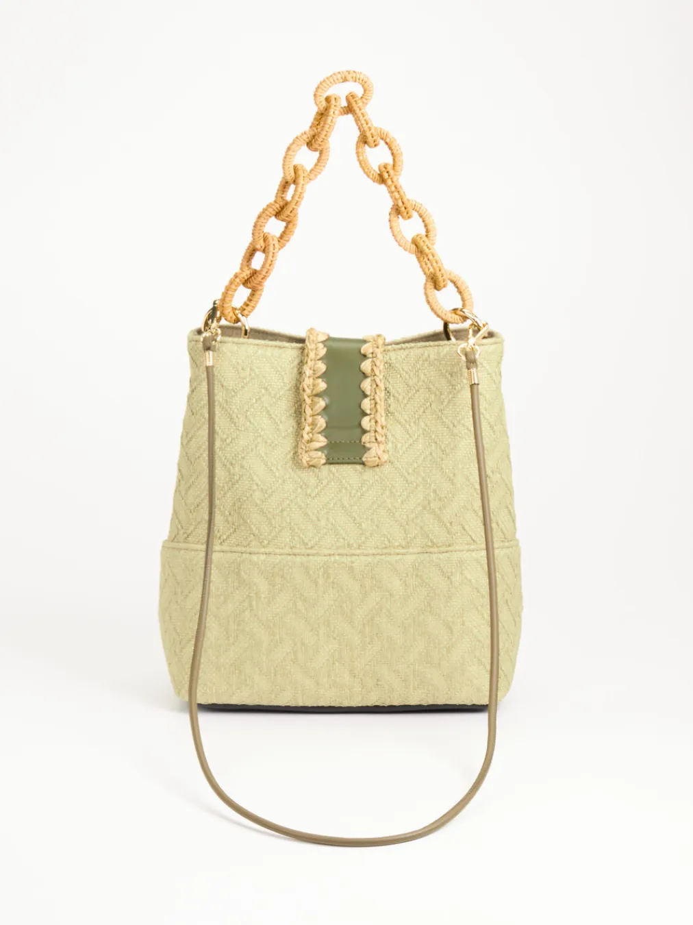 Die Bucket Bag von Viamailbag vereint gewebtes Textil, Bastakzente und olivgrünes Kalbleder zu einem stilvollen Begleiter für sommerliche Outfits.